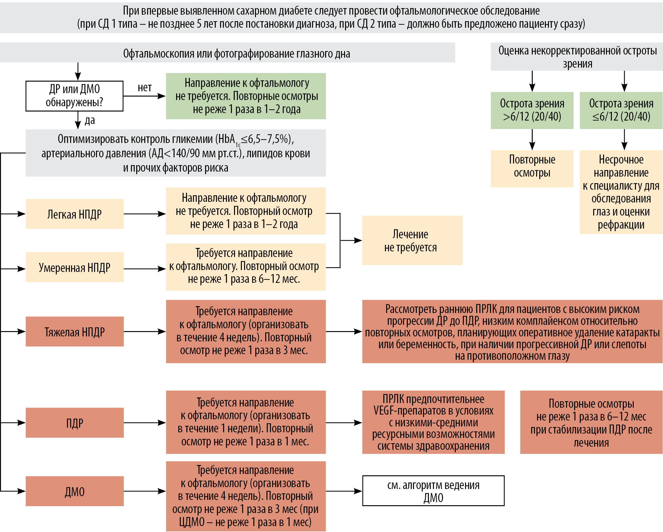 Рис. 1. Подход к офтальмологическому обследованию пациентов с сахарным диабетом и ведению диабетической ретинопатии и диабетического макулярного отека по ICO 2017 г., NICE 2004 г., с адаптацией [26, 59]: АД – артериальное давление; ДМО – диабетический макулярный отек; ДР – диабетическая ретинопатия; НПДР – непролиферативная ДР; ПДР – пролиферативная ДР; ПРЛК – панретинальная лазерная коагуляция; СД – сахарный диабет; HbA1c – гликированный гемоглобин; ICO – Международный совет по офтальмологии; NICE – Национальный институт здравоохранения и клинического мастерства; VEGF – сосудистый эндотелиальный фактор роста. Острота зрения 6/12 (20/40) соответствует остроте зрения 0,5 в десятичной системе.