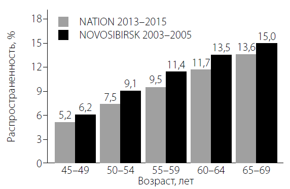 According to the population screening in 2003–2005, among Novosibirsk residents aged 45–69 years, DM2 prevalence was 11.3%. DM2 prevalence was higher in older age groups, with a maximum frequency of 15% in the age group of 65–69 years. A comparison with DM2 prevalence reported in the NATION study enables the evaluation of the data obtained in the present Novosibirsk-based study as a representative for Russia.