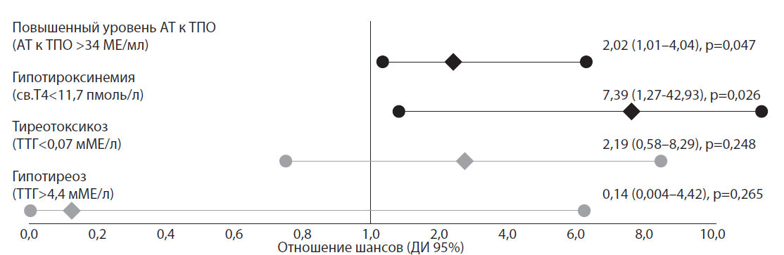 Рис. 3. Связь функции щитовидной железы и риска развития ГСД по данным регрессионного анализа.