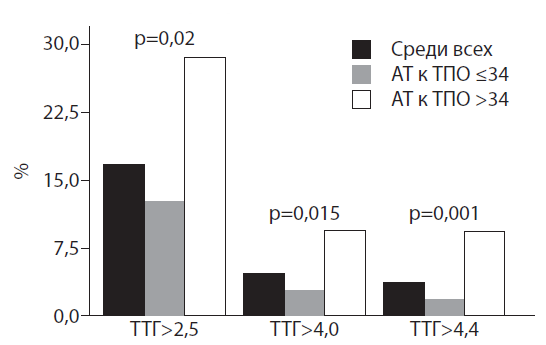 1. Fig. 1. Frequency of detection of subclinical hypothyroidism, depending on the reference values of TSH used and the level of antibodies to thyreperoxidase. | |