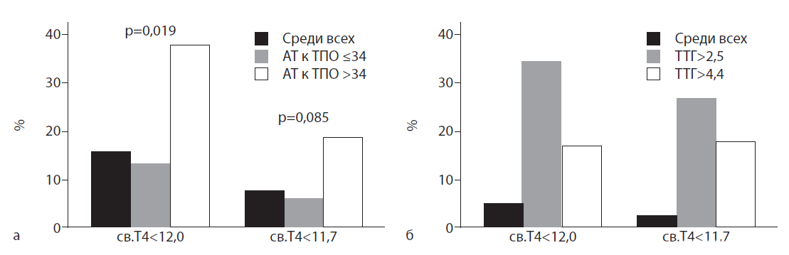 2. Fig. 2. The frequency of hypothyroxinemia when using different reference values of S. 4: a - depending on the presence of an elevated level of AT to TPO; b - depending on the level of TSH. | |