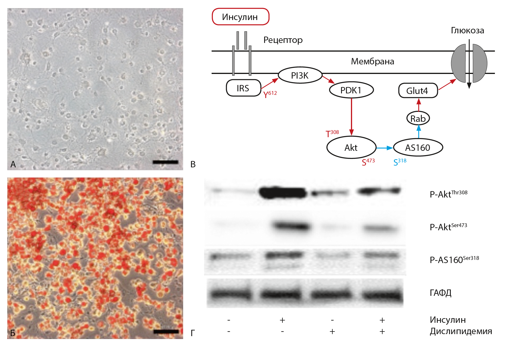 Рис. 1. Определение молекулярных маркеров ИР в линейных адипоцитах 3T3L1. (А) Культура преадипоцитов и (Б) зрелых адипоцитов 3T3L1 с липидными каплями, окрашенными OilRedO. Масштабный отрезок 100 нм. (В) Схема передачи инсулинового сигнала в жировых и мышечных клетках от рецептора до инсулинзависимого транспортера глюкозы Glut4. Красным и синим цветом показаны активирующие и ингибирующие воздействия и фосфорилируемые остатки соответственно. (Г) Способность инсулина стимулировать фосфорилирование компонентов каскада падает в условиях экспериментальной ИР, вызванной дислипидемией (обработкой клеток пальмитиновой кислотой в течение суток). Показаны репрезентативные результаты вестерн-блоттинга лизатов клеток, которые стимулировали или не стимулировали 100 нМ инсулином в течение 20 мин; для контроля нагрузки использовали окраску на глицеральдегидфосфатдегидрогеназу (ГАФД).