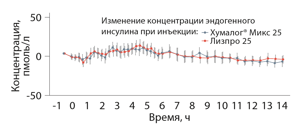 1. Fig. 1. The averaged curves of absolute changes in the concentration of endogenous insulin before and after subcutaneous injection of the test drug Insulin Lispro biphasic 25 and the comparison drug Humalog® Mix (mean ± standard deviation). | |