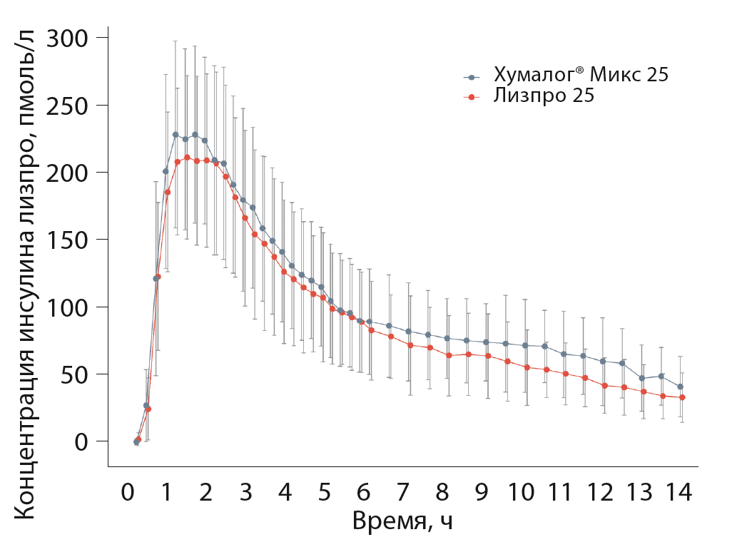 2. Fig. 2. Averaged pharmacokinetic curves of “insulin concentration lispro-time” after subcutaneous injection of the test drug Insulin Lispro biphasic 25 and the reference drug Humalog® Mix (mean ± standard deviation). | |
