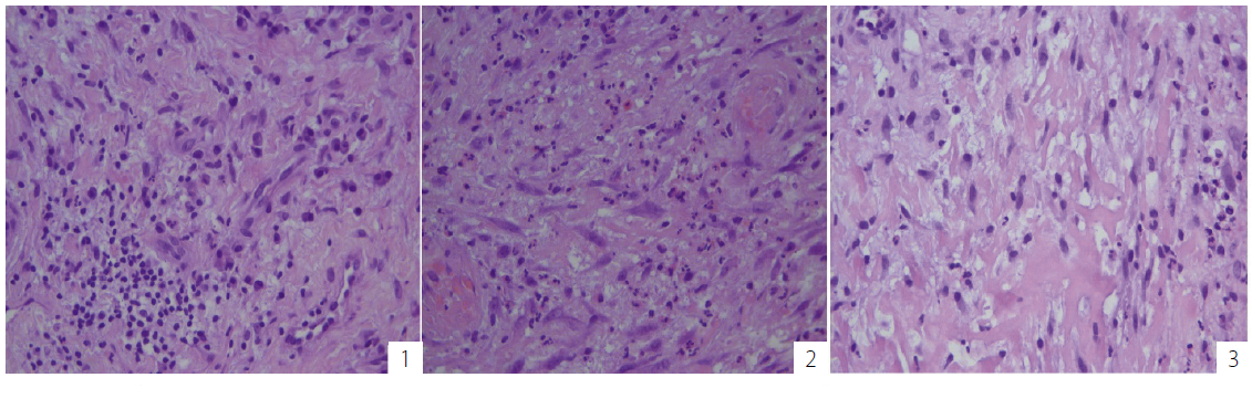 2. Рис. 1. Типичная гистологическая картина биоптатов раны на 0, 10, 15-е сутки местного лечения: 1) Эпидермис сохранен, в дерме очаги плазмоцитарной и лимфоцитарной инфильтрации; 2) Созревающая грануляционная ткань представлена мелкими сосудами, диффузной лимфо- и лейкоцитарной инфильтрацией (сегментоядерные нейтрофилы) и нежной рыхлой соединительной тканью; 3) Зрелая грануляционная ткань, умеренная лимфоцитарная инфильтрация и лейкоцитарная инфильтрация, представленная плазмоцитами с преобладанием сегментоядерных нейтрофилов, выраженная пролиферация фибробластов, сосудистый лейкостаз. | |