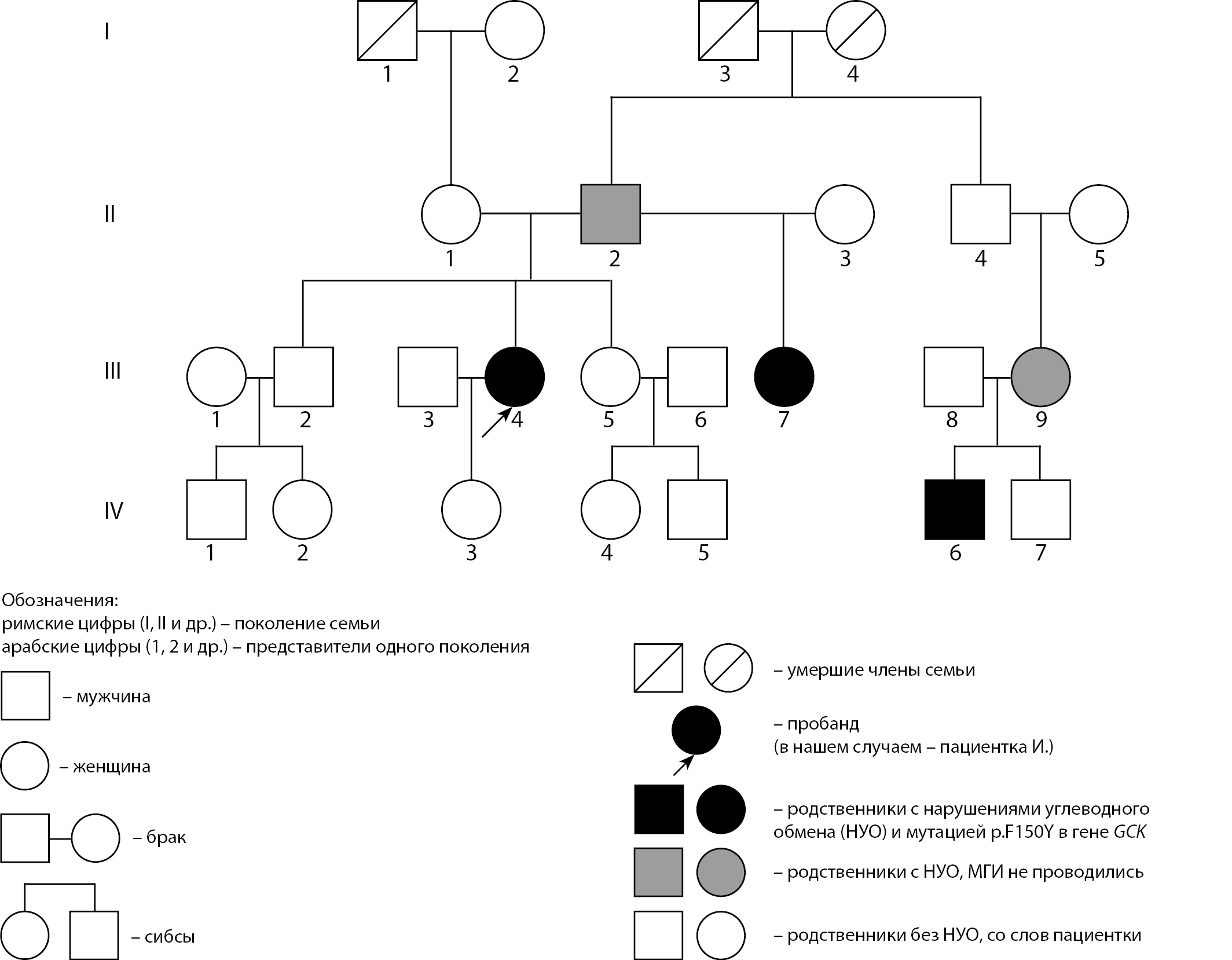двоюродная сестра (III.9): 35 лет, ИМТ 17,2 кг/м2. Активно выявлено повышение гликемии натощак 7,0 ммоль/л. При проведении ПГТТ: гликемия натощак 6,0 ммоль/л, через 2 ч – 12,3 ммоль/л;
