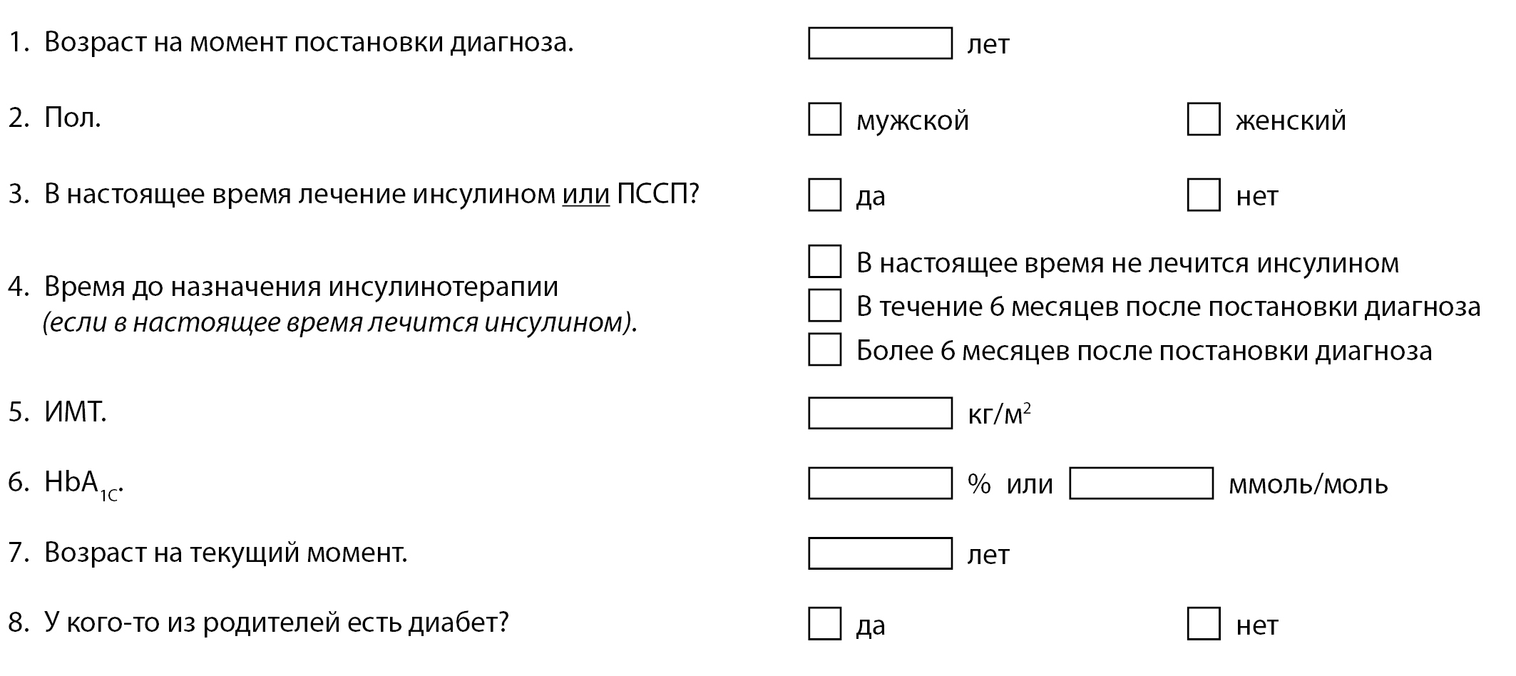 В 23 года – самопроизвольное прерывание беременности на сроке 10 недель. В 33 года во время второй беременности на 11-й неделе диагностирован гестационный СД. Была назначена интенсифицированная инсулинотерапия, на фоне которой достигнуты целевые показатели гликемии (перед родами Левемир 16 Ед на ночь, НовоРапид по 9–10 Ед перед основными приемами пищи: 0,65 Ед/кг/сут). Вес до беременности 62,5 кг, перед родами – 71 кг (общая прибавка веса 8,5 кг). Роды срочные (38-я неделя гестации), путем кесарева сечения, вес ребенка при рождении 2560 г. Через 2 мес после родов проведен ПГТТ: гликемия натощак 6,6 ммоль/л, через 2 ч – 11,0 ммоль/л; С-пептид натощак 262 пмоль/л (0,79 нг/мл), через 2 ч – 1478 пмоль/л, тиреотропный гормон (ТТГ) – 0,46 мМЕ/л. Рекомендована низкоуглеводная диета.