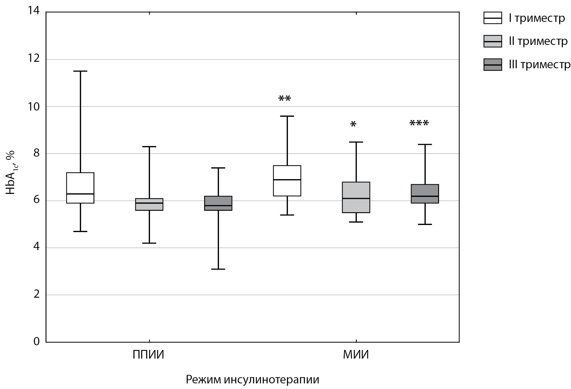 Рис. 2. Динамика уровня гликированного гемоглобина в течение беременности у женщин с сахарным диабетом 1 типа, использовавших режимы постоянной подкожной инфузии инсулина (ППИИ) и множественных инъекций инсулина (МИИ) (* – p<0,05; ** – p<0,01; *** – p<0,001 – отличия МИИ от ППИИ в соответствующих триместрах беременности). (Для сравнения был использован критерий Манна–Уитни. Данные представлены как медианы, границы «бокса» – 25 и 75 перцентили, «усы» – минимальное и максимальное значения в выборке.)