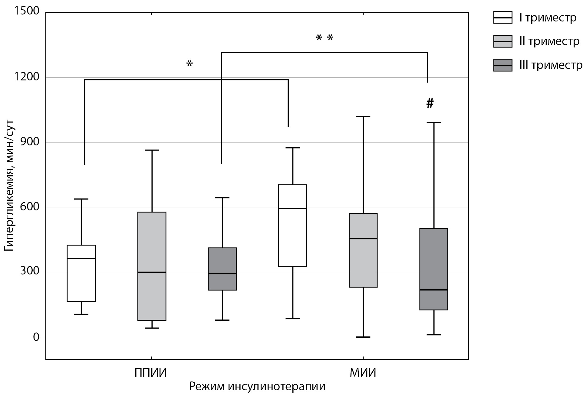 Рис. 3. Показатели длительности гипергликемии в I, II и III триместрах беременности по результатам непрерывного мониторирования глюкозы у женщин, использовавших режимы постоянной подкожной инфузии инсулина (ППИИ) и множественных инъекций инсулина (МИИ) (* – p<0,05; ** – p<0,01 – отличие показателя в группе МИИ от ППИИ в соответствующем триместре; # – p<0,05 – отличие показателя от его значения в I триместре в соответствующей группе). (Для сравнения был использован критерий Манна–Уитни. Данные представлены как медианы, границы «бокса» – 25 и 75 перцентили, «усы» – минимальное и максимальное значения в выборке.)