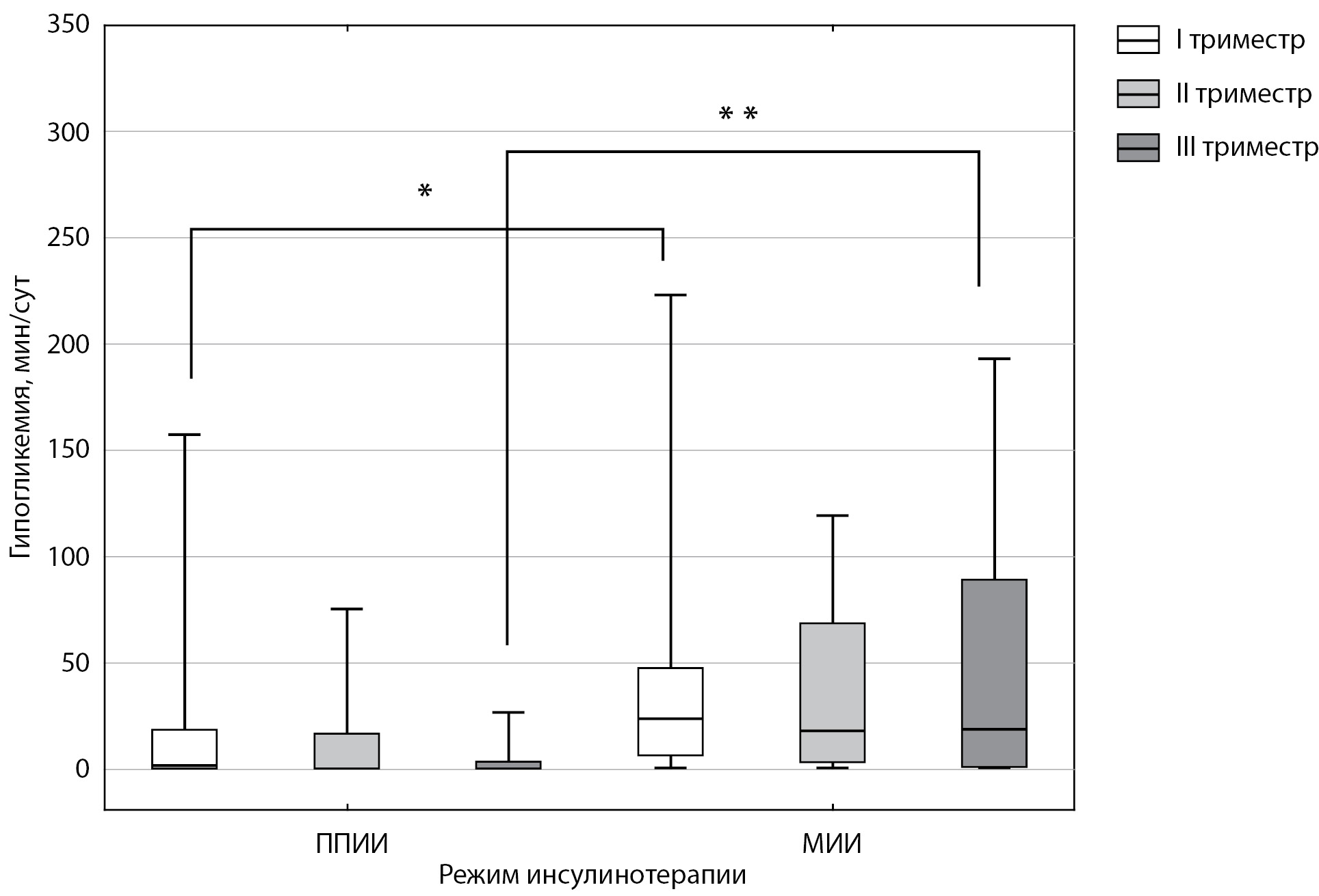 Рис. 4. Показатели длительности гипогликемических состояний в I, II и III триместрах беременности на основании непрерывного мониторирования глюкозы у женщин с сахарным диабетом 1 типа, использовавших режимы постоянной подкожной инфузии инсулина (ППИИ) и множественных инъекций инсулина (МИИ) (* – p<0,05; ** – p<0,01– отличие показателя в группе МИИ от ППИИ в соответствующем триместре). (Для сравнения был использован критерий Манна–Уитни. Данные представлены как медианы, границы «бокса» – 25 и 75 перцентили, «усы» – минимальное и максимальное значения в выборке.)