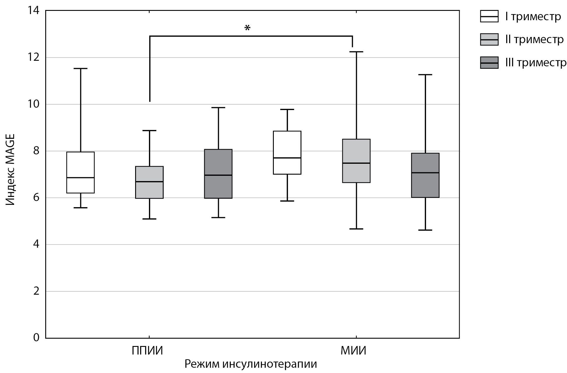 Рис.5, А. Показатели индекса MAGE в I, II и III триместрах беременности у женщин с сахарным диабетом 1 типа, использовавших режимы постоянной подкожной инфузии инсулина (ППИИ) и множественных инъекций инсулина (МИИ) (* – p<0,05 – отличие показателя в группе МИИ от ППИИ в соответствующем триместре). (Для сравнения был использован критерий Манна–Уитни. Данные представлены как медианы, границы «бокса» – 25 и 75 перцентили, «усы» – минимальное и максимальное значения в выборке.)
