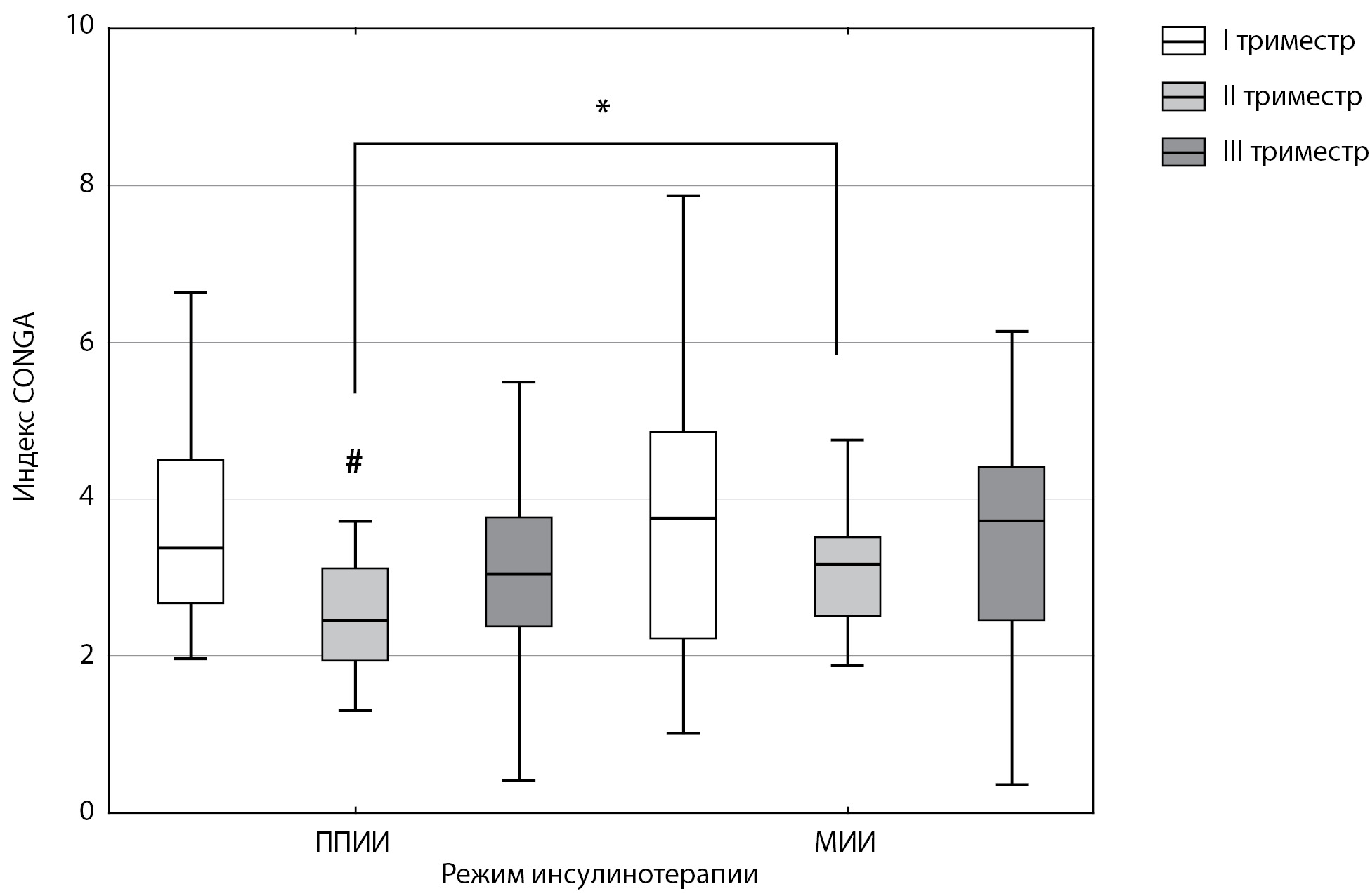 Рис. 5, В. Показатели индекса CONGA в I, II и III триместрах беременности у женщин с сахарным диабетом 1 типа, использовавших постоянную подкожную инфузию инсулина (ППИИ) и множественные инъекции инсулина (МИИ) (* – p<0,05 – отличие показателя в группе МИИ от группы ППИИ в соответствующем триместре; # – p<0,05 – отличие показателя от его значения в I триместре в соответствующей группе). (Для сравнения был использован критерий Манна–Уитни. Данные представлены как медианы, границы «бокса» – 25 и 75 перцентили, «усы» – минимальное и максимальное значения в выборке.)