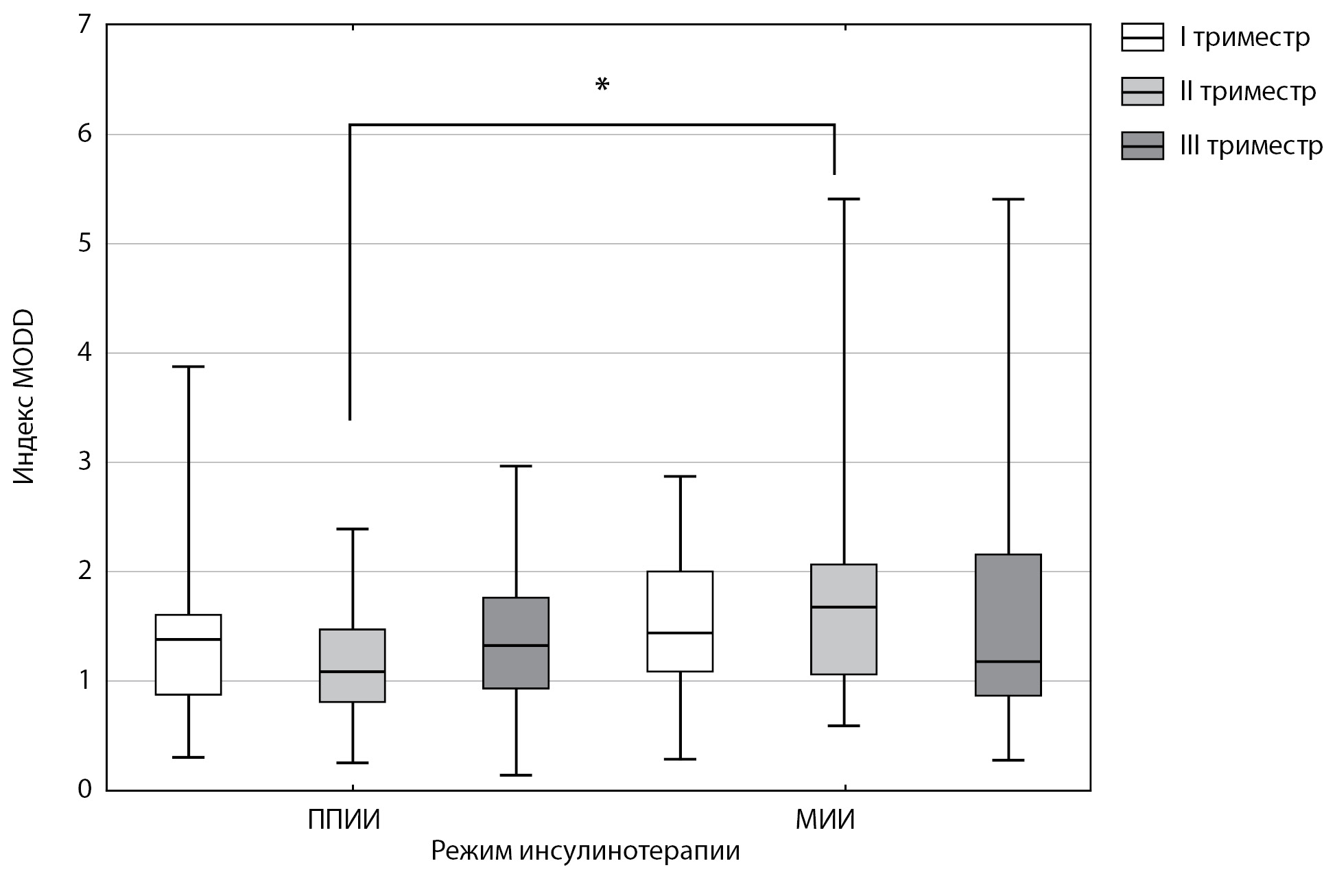 Рис. 5, Б. Показатели индекса MODD в I, II и III триместрах беременности у женщин с сахарным диабетом 1 типа, использовавших постоянную подкожную инфузию инсулина (ППИИ) и множественные инъекции инсулина (МИИ) (* – p<0,05 – отличие показателя в группе МИИ от ППИИ в соответствующем триместре). (Для сравнения был использован критерий Манна–Уитни. Данные представлены как медианы; границы «бокса» – 25 и 75 перцентили; «усы» – минимальное и максимальное значения в выборке.)