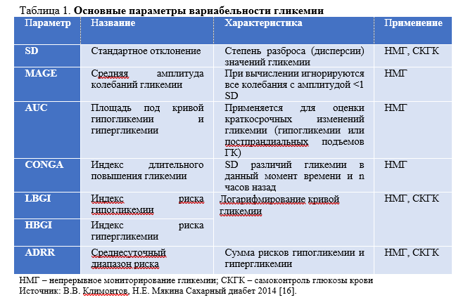 Таблица 1. Основные параметры вариабельности гликемии [16]