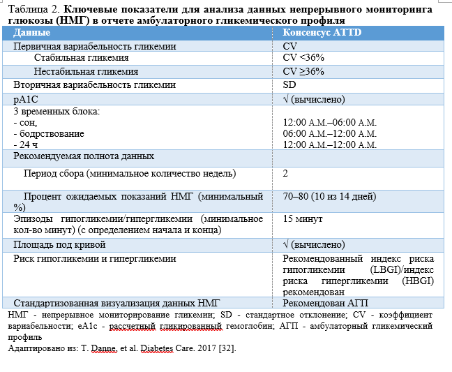 Примечания: НМГ – непрерывное мониторирование гликемии; SD – стандартное отклонение; CV – коэффициент вариабельности; рА – расчетный гликированный гемоглобин; АГП – амбулаторный гликемический профиль; ATTD - Advanced Technologies & Treatments for Diabetes. Адаптировано из [32].