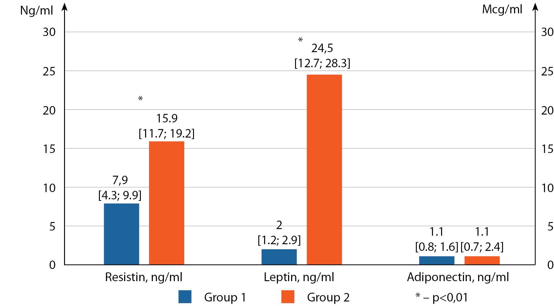 Изучение содержания адипогормонов проводили при помощи лабораторных наборов для иммуноферментного анализа: лептина – Bcm diagnostic llc (Германия), резистина – Biovendor laboratory (Чехия), адипонектина – eBioscience (Австрия).