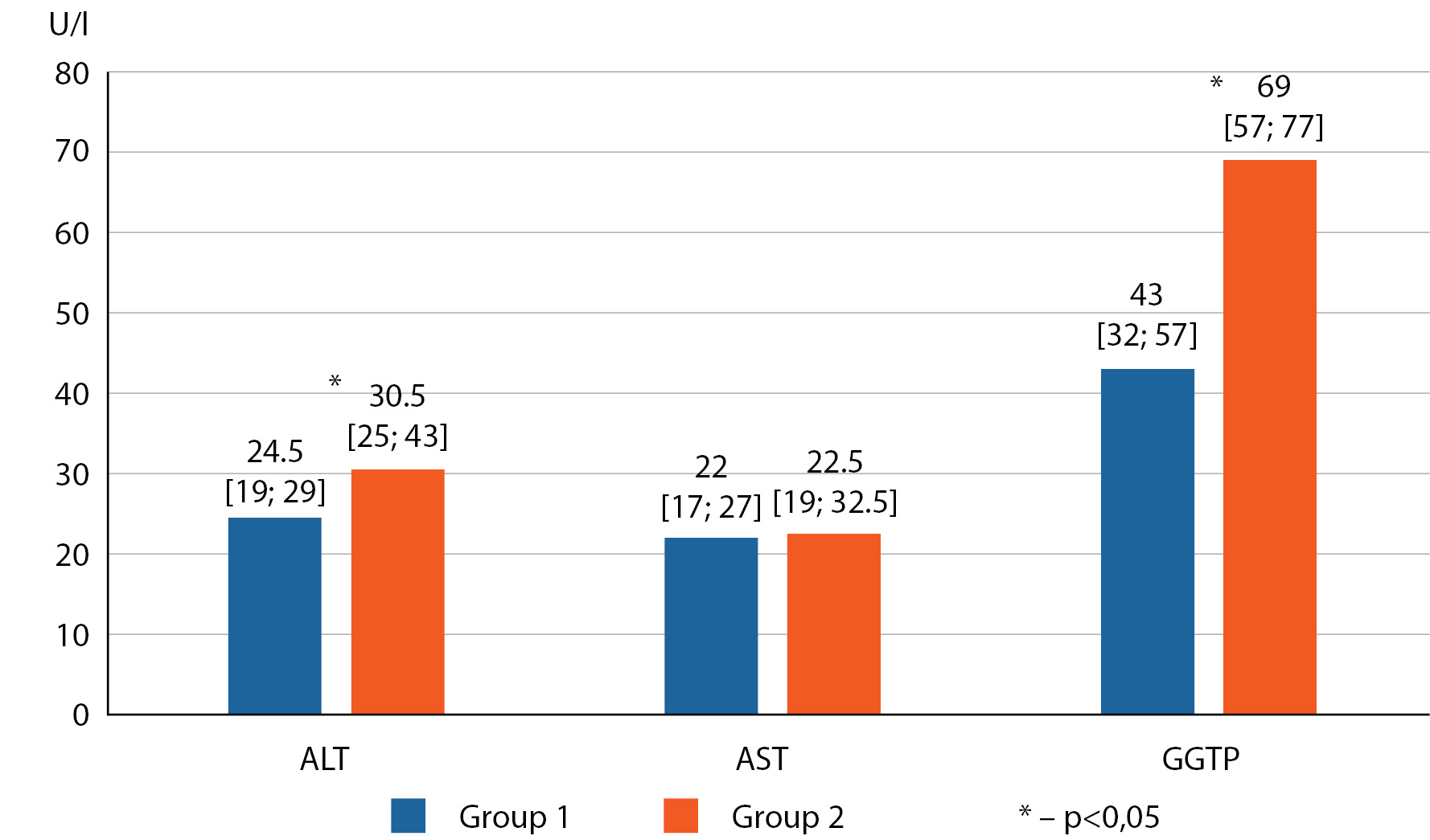 Активность ферментов печени у обследуемых представлена на рис. 2. При оценке функции печени не было выявлено достоверных различий в содержании общего и прямого билирубина, а также АСТ в группах. Однако у мужчин с гипогонадизмом активность АЛТ была на 24,5% выше (р=0,02), а ГГТП – на 60,5% выше (р=0,001), чем у эугонадных пациентов. При этом известно, что именно ГГТП имеет максимальную чувствительность и специфичность в плане диагностики патологии печени. Это дополнялось статистически значимым различием в соотношении ферментов АСТ/АЛТ, характеризуемом коэффициентом де Ритиса, который был значимо выше (р=0,047) на 60,4% у пациентов 2-й группы (0,74 [0,61; 0,89] единиц) по сравнению с 1-й (0,8 [0,75; 0,94] единиц), что подтверждает поражение печени у обследуемых.
