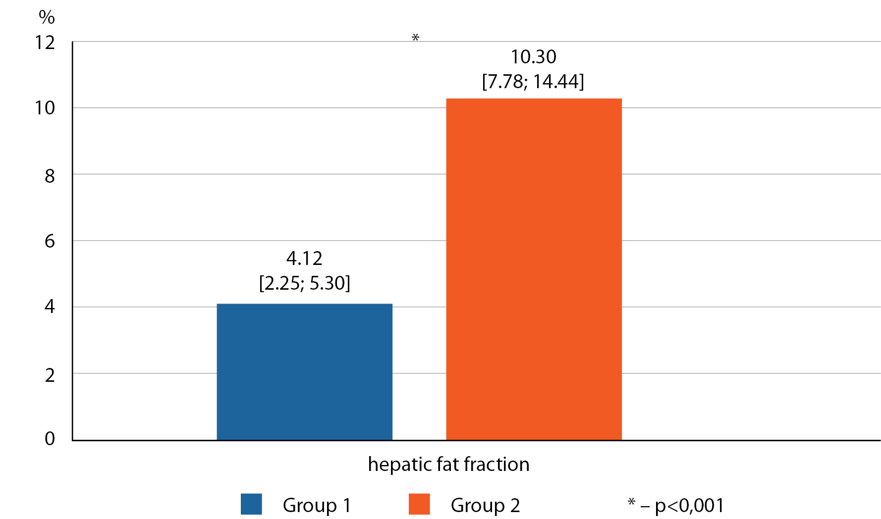 Выявленные изменения в лабораторных показателях дополняются данными инструментальных исследований, представленными на рис. 3. Протонная плотность фракции жира в печени по данным МРТ в 1-й группе составила 4,12 [2,25; 5,30]%, а во 2-й группе – 10,30 [7,78; 14,44]%. Таким образом, фракция жира печени была в 2,5 раза выше у мужчин с дефицитом Т по сравнению с эугонадными пациентами (р<0,001), что демонстрирует значимо большую выраженность неалкогольного стеатогепатоза у данной категории больных.