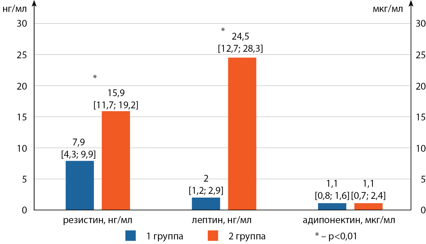 The content of adipohormones was studied using laboratory kits for enzyme-linked immunosorbent assay: leptin (Bcm Diagnostic LLC, Germany), resistin (Biovendor Laboratory, Czech Republic), and adiponectin (eBioscience, Austria).