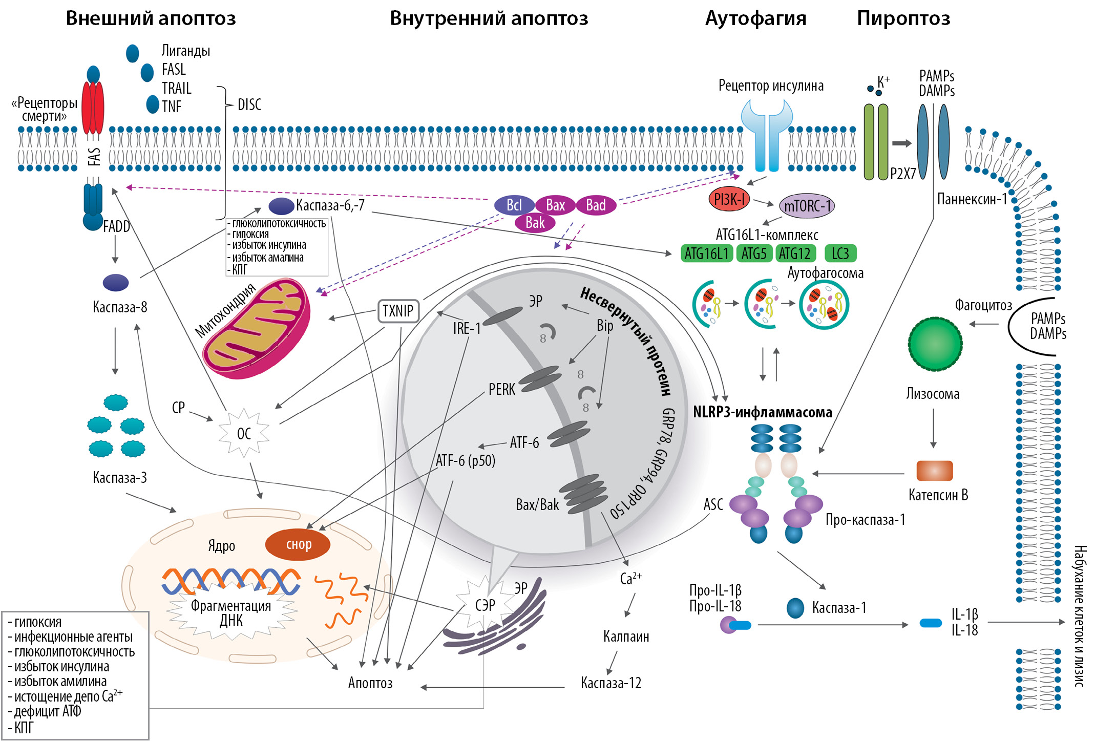 1. Fig. 1. Programmable cell death of β-cells in type 2 diabetes mellitus: FASL - FAS ligand; FAS - death receptor from the family of tumor necrosis factors (TNF); TRAIL - TNF-inducing ligand (tumor-necrosis-factor-related apoptosis-inducing ligand); TNF - tumor necrosis factor; DISC - death induction signaling complex; FADD - receptor-linked adapter protein (FAS receptor associated death domen); SR - free radicals; OS - oxidative stress; CHOP is a transcription factor involved in the regulation of apoptosis; Bax, Bak, Bad-family of proapoptotic proteins; Bcl - a family of anti-apoptogenic proteins; ER - endoplasmic reticulum; SER - ER stress; GRP94 - glucose-regulated protein, chaperone; ORP150 - oxygen-regulated protein, chaperone; BIP - immunoglobulin binding protein, chaperone (binding immunoglobulin protein); PERK, IRE1, ATF6 - “ER stress sensors” - transmembrane proteins having a regulatory domain immersed in the lumen of the ER; PERK - PKR-like kinase of the endoplasmic reticulum (pancreatic endoplasmic reticulum kinase); IRE1 - type 1 inositol-dependent enzyme; ATF6 - activating transcription factor 6; TXNIP - thioredoxin-interacting protein (thioredoxin-interacting protein); PAMPs - pathogen-associated molecular patterns (pathogen-associated molecular patterns); DAMPs - molecules released during tissue damage (damage-associated molecular-pattern molecules); P2X7 - purinergic receptor; NLRP3 - containing the NACHT, LRR and PYD domains protein 3 (NACHT, LRR and PYD domains-containing protein 3); ASC - adapter molecule of the NLRP3-inflammasome (apoptosis associated speck-like protein containing a CARD); IL-1β - interleukin 1 beta; IL-18 - interleukin 18; AMPK - AMP-activated protein kinase (AMP-activated protein kinase); mTOR — mammalian rapamycin target (mammalian Target Of Rapamycin); mTORC-1 - mTOR complex 1 (mTOR complex 1); Atg - a family of proteins associated with autophagy (autophagy-related protein); PI3K-1 - phosphatidylinositol-3-kinase-1 (phosphatidylinositol-3-kinase); LC3 - autophagy protein (light chain 3); CNG - end products of glycation. | |