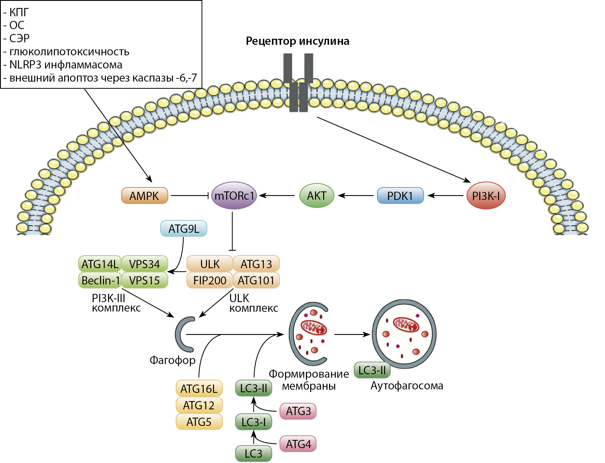 2. Fig. 2. The process of initiation of autophagy of β-cells in type 2 diabetes mellitus: CNG - end glycation products; OS - oxidative stress; ER - endoplasmic reticulum; SER - ER stress; AMPK - AMP-activated protein kinase (AMP-activated protein kinase); mTOR — mammalian rapamycin target (mammalian Target Of Rapamycin); mTORC-1 - mTOR complex 1 (mTOR complex 1); Atg - a family of proteins associated with autophagy (autophagy-related protein); ACT - protein kinase B; PDK1 - pyruvate dehydrogenase kinase, isoform 1 (phosphoinositide-dependent protein kinase-1); PI3K-1 - phosphatidylinositol-3-kinase-1 (phosphatidylinositol-3-kinase); LC - autophagy proteins (light chain); ULK - Unc-51-like kinase (Unc-51-Like Kinase); Beclin - autophagy cell system protein; FIP200 is a protein interacting with the FAK family of 200 kDa (FAK family-interacting protein of 200 kDa). | |