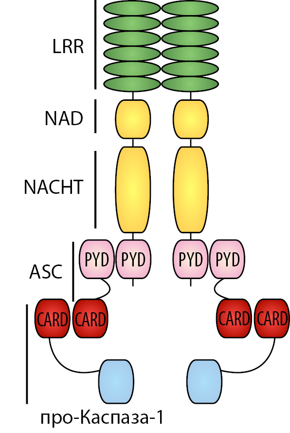 3. Fig. 3. The structure of the NLRP3 inflammasomes: LRR is a domain containing a leucine-rich repeat domain; NAD - NBD-associated domain (NBD-associated domain); NACHT - protein, inhibiting neuronal apoptosis (neuronal apoptosis inhibitory protein); ASC is an adapter molecule containing CARD and PYD domains (apoptosis associated speck-like protein containing a CARD). | |