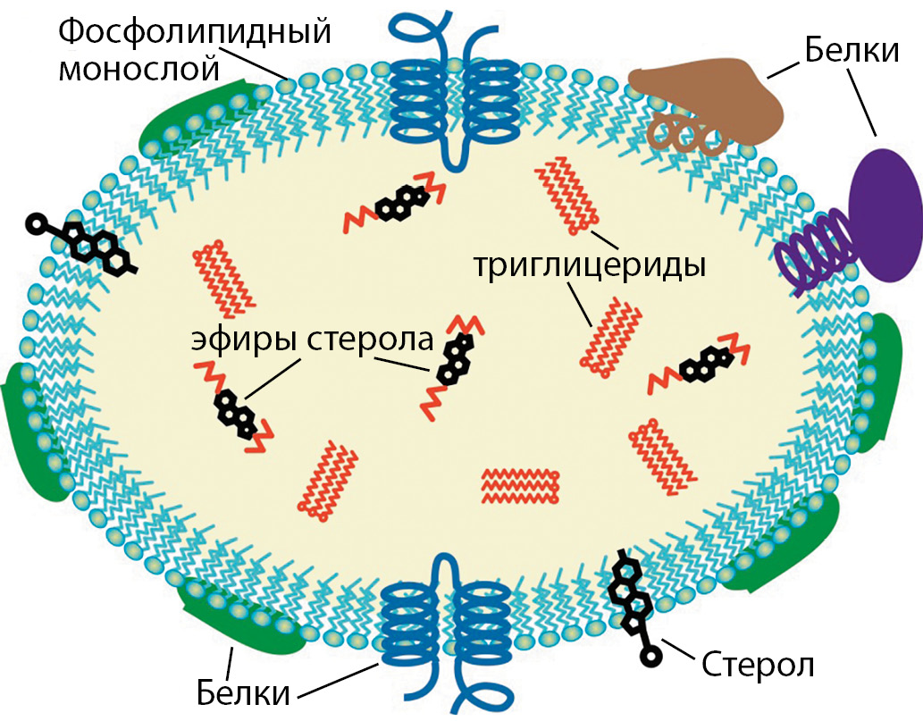 Исследования структуры, биогенезиса и метаболизма ЖВ, взаимодействия с внутриклеточными органеллами и само расположение ЖВ внутри клеток приобретают все большую актуальность в исследовании различных патологий [1, 2, 4–7]. Структура ЖВ отличается от других клеточных органелл: центральная часть гидрофобных (нейтральных) липидов окружена единственной мембраной из амфипатических липидов (в основном фосфолипидов) и белков (рис. 1).