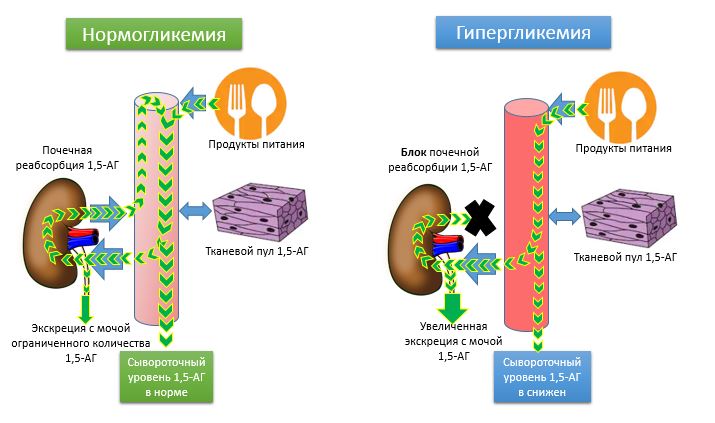 1,5-АГ хорошо всасывается в кишечнике и распределяется по всем органам и тканям, структура с замкнутым пирановым кольцом обеспечивает метаболическую стабильность. Выведение 1,5-АГ со стулом незначительное и осуществляется в основном почками. Молекула 1,5-АГ свободно фильтруется, при этом 99,9% 1,5-АГ впоследствии реабсорбируется, обеспечивая его стабильный уровень в плазме крови. Реабсорбция 1,5-АГ происходит в почечных канальцах системой общего транспорта 1,5-АГ/фруктоза/манноза, которая отличается от основной системы реабсорбции глюкозы [6].