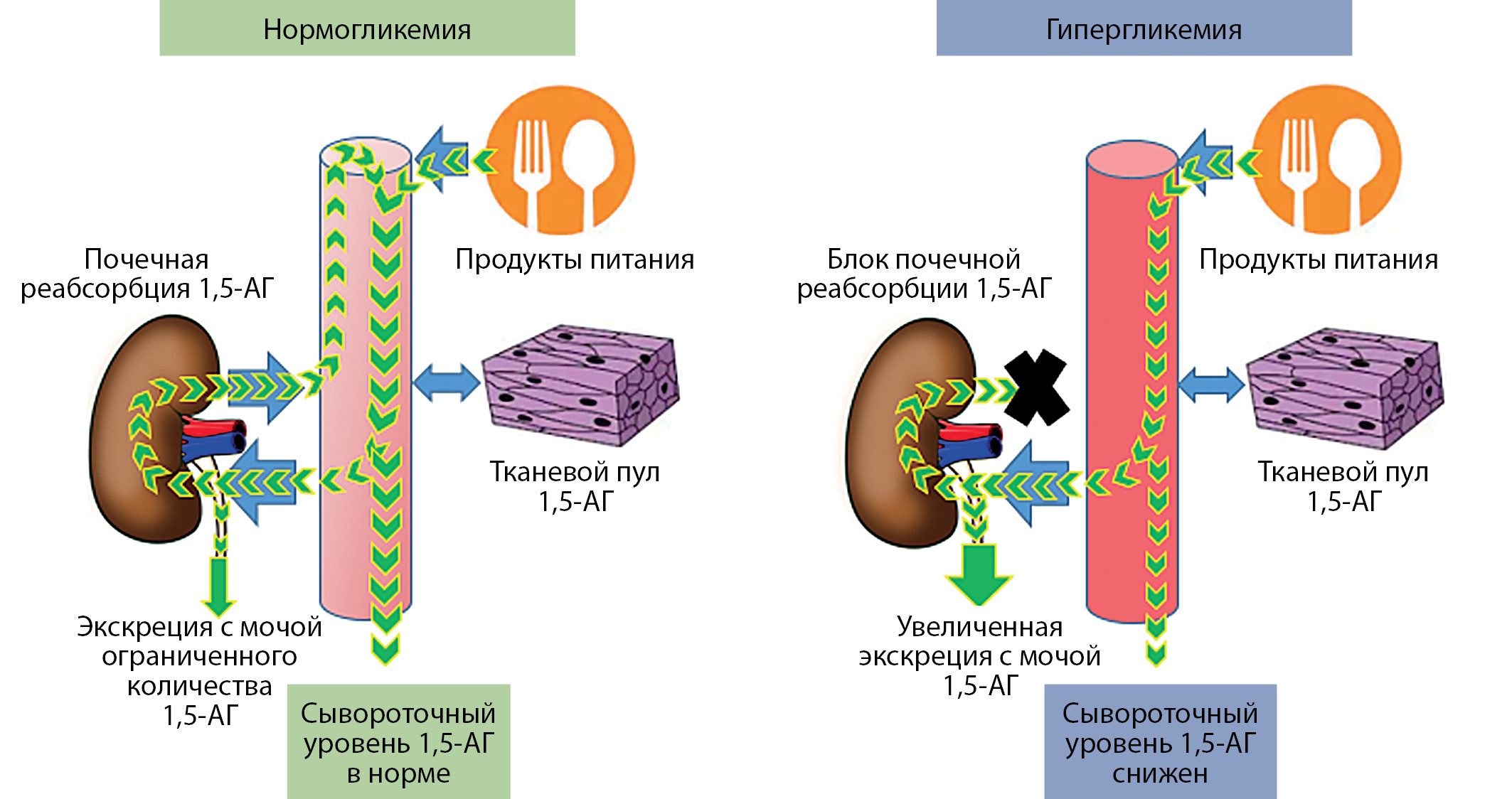 При нормальном уровне глюкозы концентрация 1,5-АГ в плазме крови поддерживается на постоянном уровне за счет баланса между поступлением и выведением через почки. В условиях гипергликемии, когда превышен почечный порог для глюкозы, концентрация 1,5-АГ в крови падает за счет конкурентного ингибирования его реабсорбции глюкозой (рис. 2). Изменение уровня 1,5-АГ при этом зависит от продолжительности и величины глюкозурии. После возвращения концентрации глюкозы в нормальный диапазон восстановление концентрации 1,5-АГ в крови происходит со скоростью ~0,3 мкг*мл/день. Таким образом, уровень 1,5-АГ чувствительно и быстро реагирует на изменения уровня глюкозы в крови, отражая даже кратковременные подъемы гликемии в промежутке времени от 48 ч до 2 нед [7].