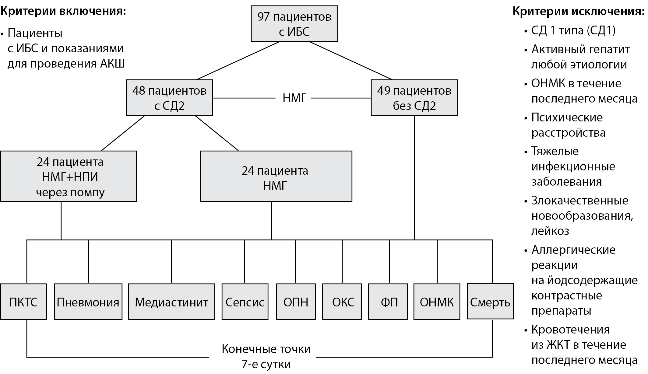 Примечания*: СД2 – сахарный диабет 2 типа; ИБС – ишемическая болезнь сердца; АКШ – аортокоронарное шунтирование; НМГ – непрерывный мониторинг глюкозы; НПИ – непрерывная подача инсулина; ПКТС – посткардиотомный синдром; ОПН – острая почечная недостаточность; ОКС – острый коронарный синдром; ФП – фибрилляция предсердий; ОНМК – острое нарушение мозгового кровообращения.