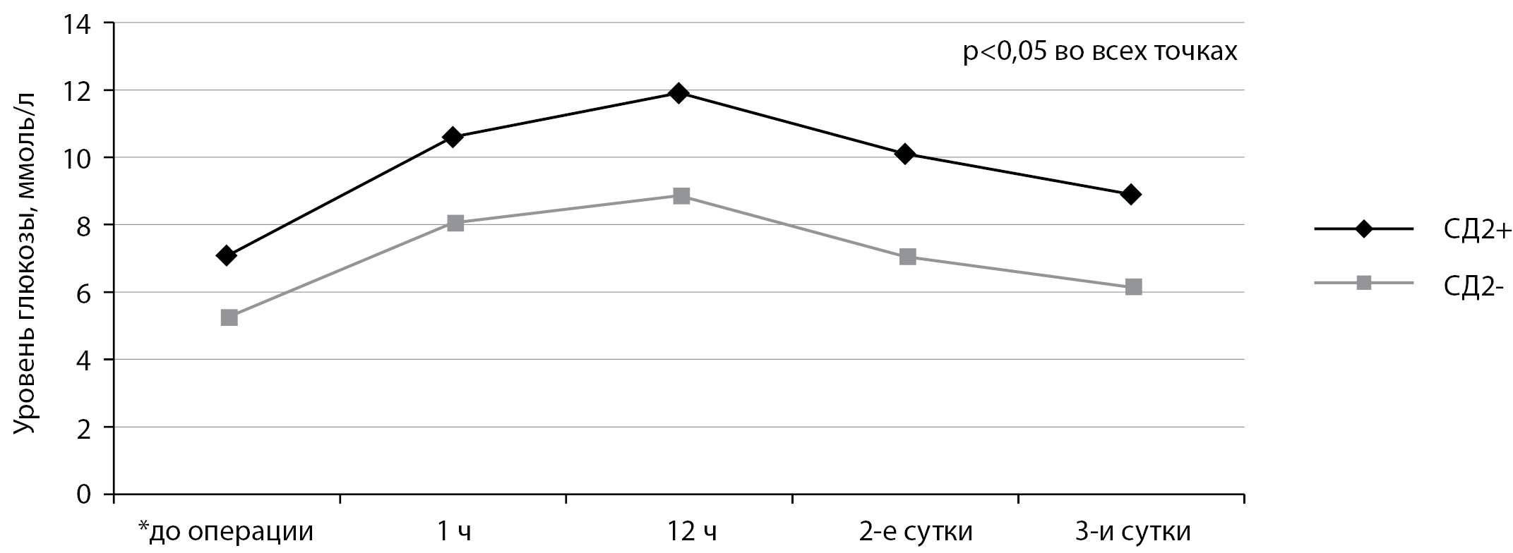 Примечания*: уровень глюкозы (Ме [Q25; Q75]) в группе больных сахарным диабетом 2 типа (СД2+) до операции – 7,08 [5,5; 8,6]; через 1 ч после операции – 10,6 [7,93; 13,2]; через 12 ч после операции – 11,9 [9,2; 14,55]; на 2-е сутки – 10,1 [7,93; 13,85]; на 3-и сутки – 8,9 [6,65; 10,15] ммоль/л. Уровень глюкозы составил в группе пациентов без диабета (СД2–) до операции – 5,25 [4,9; 6,4]; через 1 ч после операции – 8,05 [7,2; 9,35]; через 12 ч после операции – 8,85 [7,0; 11,05]; на 2-е сутки – 7,05 [6,03; 8,25]; на 3-и сутки – 6,15 [5,43; 7,48] ммоль/л. Статистически значимое различие между группами (р<0,05) при расчете U-критерия Манна–Уитни достигнуто во всех точках.