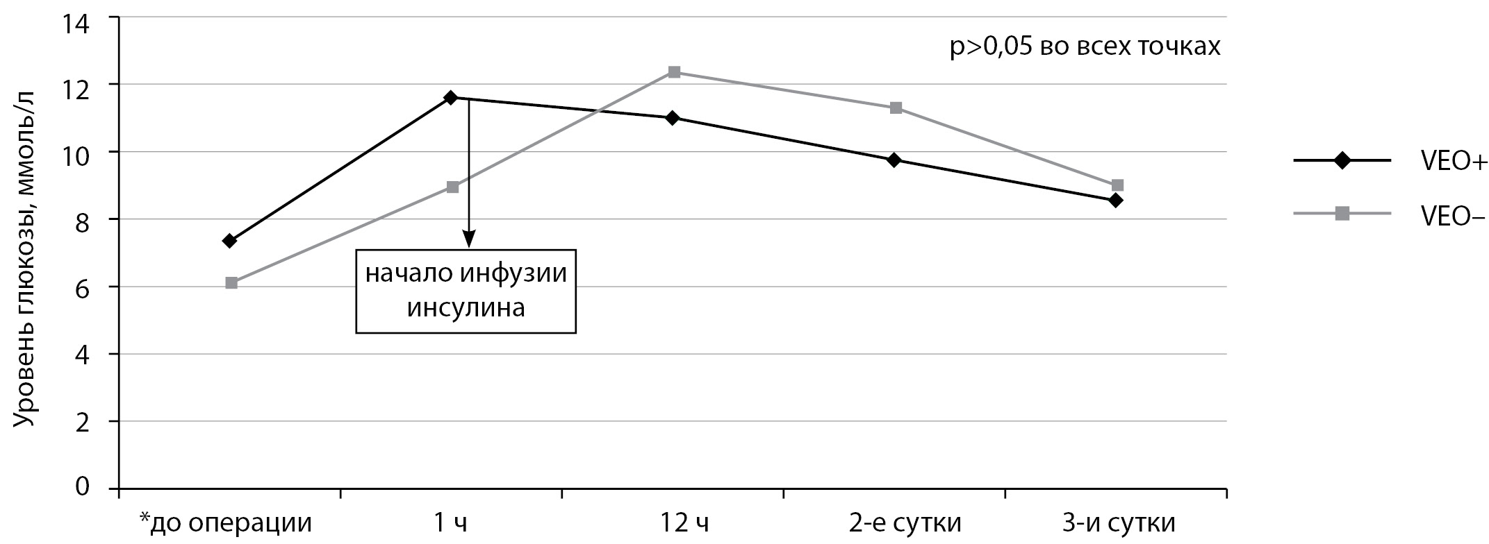 Примечания*: уровень глюкозы (Ме [Q25; Q75]) в подгруппе больных, которым осуществлялась непрерывная инфузия инсулина с помощью помпы (VEO+), до операции – 7,35 [5,63; 9,15]; через 1 ч после операции – 11,6 [9,78; 15,1]; через 12 ч после операции – 11,0 [9,2; 14,2]; на 2-е сутки – 9,75 [7,73; 11,4]; на 3-и сутки – 8,55 [6,28; 9,89] ммоль/л. Уровень глюкозы в подгруппе больных, которым осуществлялись внутривенные болюсные инъекции инсулина (VEO–), до операции – 6,25 [4,9; 6,4]; через 1 ч после операции – 8,94 [7,34; 11,1]; через 12 ч после операции – 12,35 [8,73; 15,85]; на 2-е сутки – 11,3 [8,24; 14,15]; на 3-и сутки – 9,0 [7,45; 10,85] ммоль/л. Статистически значимое различие между группами при расчете U-критерия Манна–Уитни не достигнуто во всех точках.