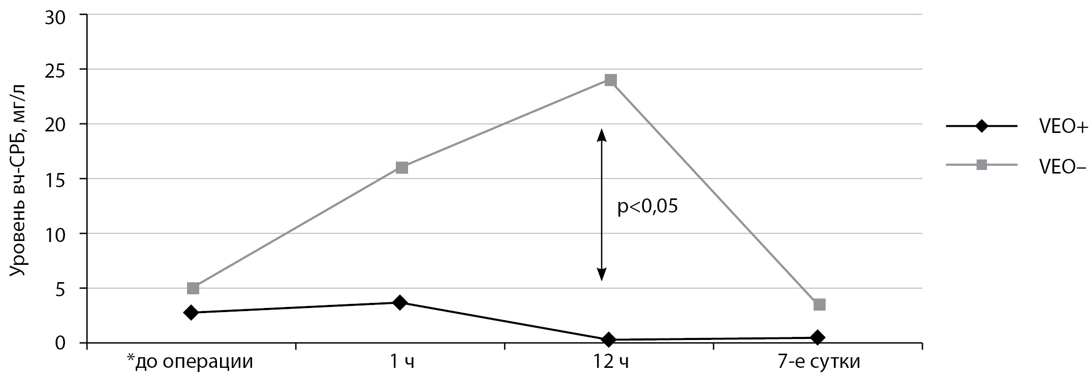 Примечания*: уровень вч-СРБ (Ме [Q25; Q75]) в подгруппе больных, которым осуществлялась непрерывная инфузия инсулина с помощью помпы (VEO+), до операции – 2,77 [0,19; 4,4]; через 1 ч после операции – 3,67 [1,2; 5,1]; через 12 ч после операции – 0,3 [0,1; 0,7]; на 7-е сутки – 0,5 [0,3; 1,4] мг/л. Уровень вч-СРБ в подгруппе больных, которым осуществлялись внутривенные болюсные инъекции инсулина (VEO–), до операции – 5 [0,9; 6,1]; через 1 ч после операции – 16,0 [5,7; 19,1]; через 12 ч после операции – 24,0 [7,2; 28]; на 7-е сутки – 3,5 [0,4; 3,9] мг/л. Стрелкой указана точка, в которой достигнуто статистически значимое различие между группами (р<0,05) при расчете U-критерия Манна–Уитни.