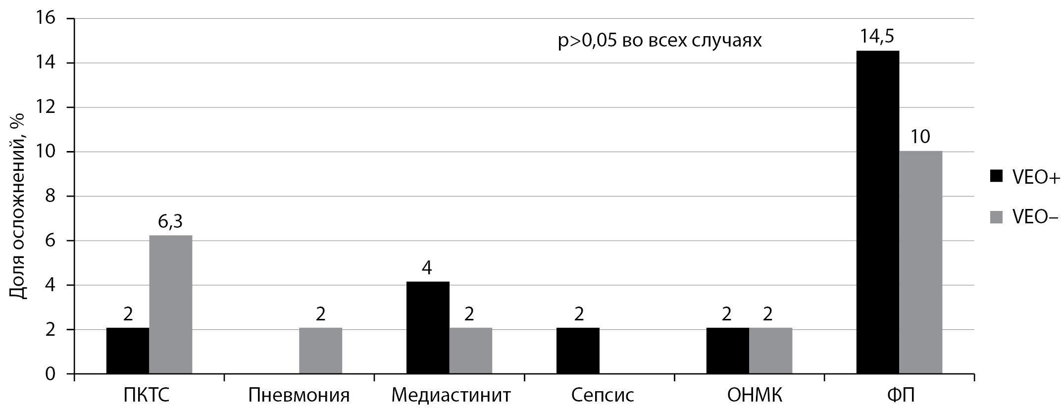 Вероятно, ввиду небольшого количества анализируемых послеоперационных осложнений различия между группами по госпитальным исходам не достигли статистической значимости.