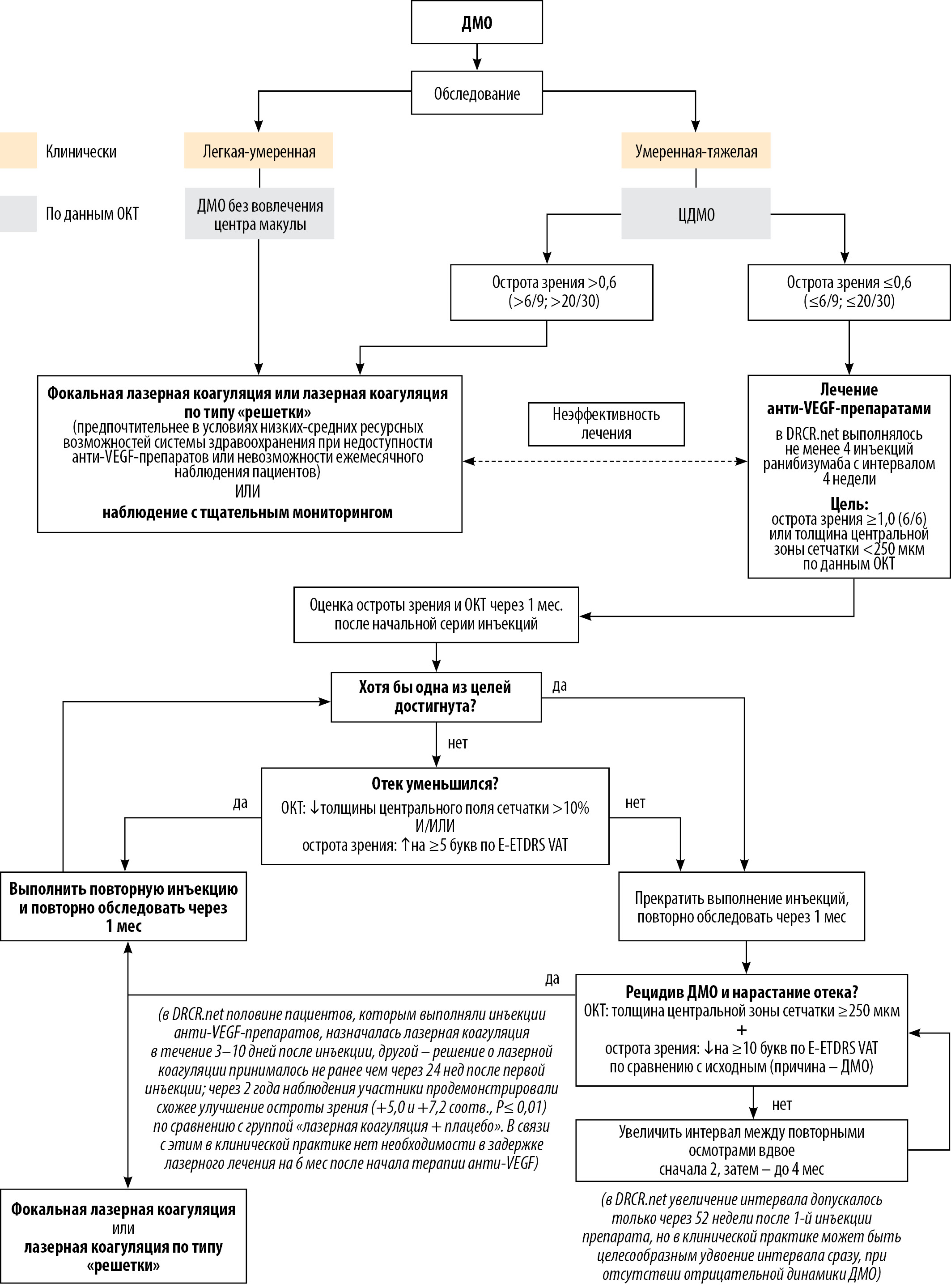 2. Fig. 2. Schematic approach to the management of patients with diabetic macular edema according to protocol I DRCR.net, ICO 2017, Michael S. Ip, with adaptation [26, 55, 60]: DME - diabetic macular edema; OCT - optical coherence tomography; TsDMO - DMO involving the center of the macula; DRCR.net - Diabetic Retinopathy Clinical Research Network; E-ETDRS VAT (Electronic ETDRS Visual Acuity Test) - electronic visual acuity test ETDRS; ETDRS - Early Treatment Diabetic Retinopathy Study; VEGF is a vascular endothelial growth factor. | |