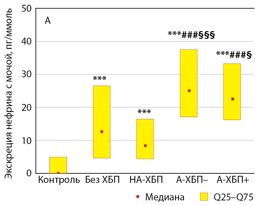 3. Рис. 2. Уровень мочевой экскреции нефрина (А) и подоцина (Б) у больных сахарным диабетом 2 типа: *** – p<0,001 в сравнении с контролем без сахарного диабета; ### – p<0,001 в сравнении с группой сахарного диабета без хронической болезни почек; § – p<0,05; §§§ – p<0,001 в сравнении с группой с нормоальбуминурическим вариантом хронической болезни почек (непараметрический медианный критерий).