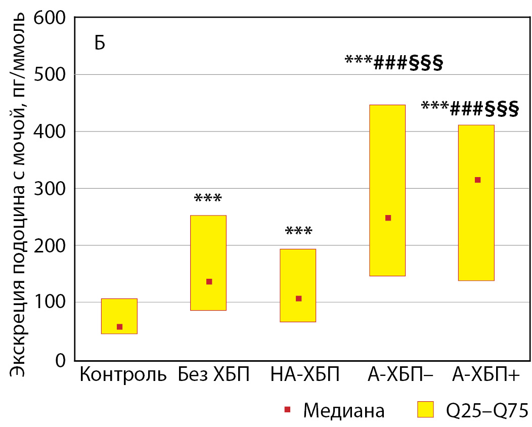 Рис. 2. Уровень мочевой экскреции нефрина (А) и подоцина (Б) у больных сахарным диабетом 2 типа: *** – p<0,001 в сравнении с контролем без сахарного диабета; ### – p<0,001 в сравнении с группой сахарного диабета без хронической болезни почек; § – p<0,05; §§§ – p<0,001 в сравнении с группой с нормоальбуминурическим вариантом хронической болезни почек (непараметрический медианный критерий).