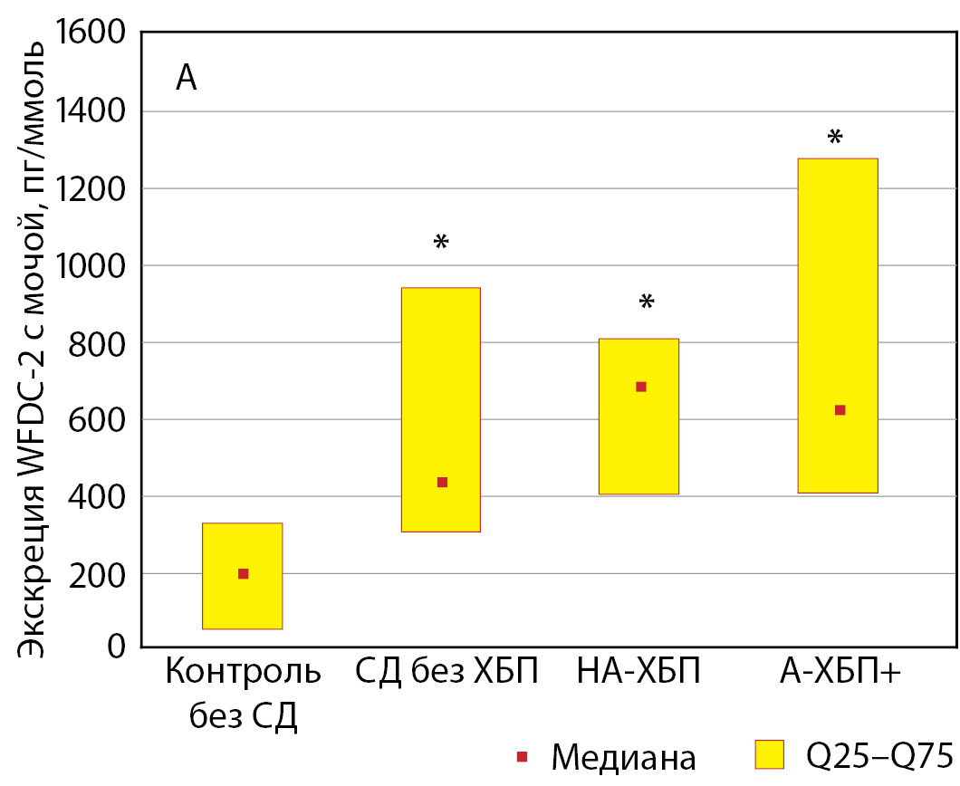 МЕТОДЫ. В наблюдательное одноцентровое одномоментное исследование включены 360 больных СД2 продолжительностью не менее 10 лет. Пациенты с соотношением альбумин/креатинин мочи (АКМ) <3 мг/ммоль и расчетной скоростью клубочковой фильтрации (СКФ) >60 мл/мин/1,73 м2 вошли в группу СД2 без ХБП (n=89). Больные с АКМ <3 мг/ммоль и СКФ <60 мл/мин/1,73 м2 сформировали группу НА-ХБП (n=111). Больные с СКФ ≥60 мл/мин/1,73 м2 и АКМ ≥3 мг/ммоль были отнесены в группу альбуминурии c сохранной функцией почек (А-ХБП–, n=87). Пациенты с СКФ <60 мл/мин/1,73 м2 и АКМ ≥3 мг/ммоль сформировали группу альбуминурической ХБП (А-ХБП+, n=73). Мочевая экскреция белков щелевой диафрагмы подоцитов (нефрина, подоцина) и основного домена WAP-типа, стабилизированного четырьмя дисульфидными связями-2 (WFDC-2), рассматриваемого как маркер тубулоинтерстициального фиброза, определялась с помощью иммуноферментного анализа (ИФА) и сравнивалась со здоровым контролем (n=20).