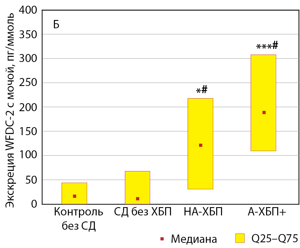 4. Рис. 3. Уровень мочевой экскреции WFDC-2 у мужчин (А) и женщин (Б) с сахарным диабетом 2 типа: * – p<0,05; *** – p<0,001 в сравнении с контролем безсахарного диабета; # – p<0,05 в сравнении с группой сахарного диабета без хронической болезни почек (непараметрический медианный критерий).