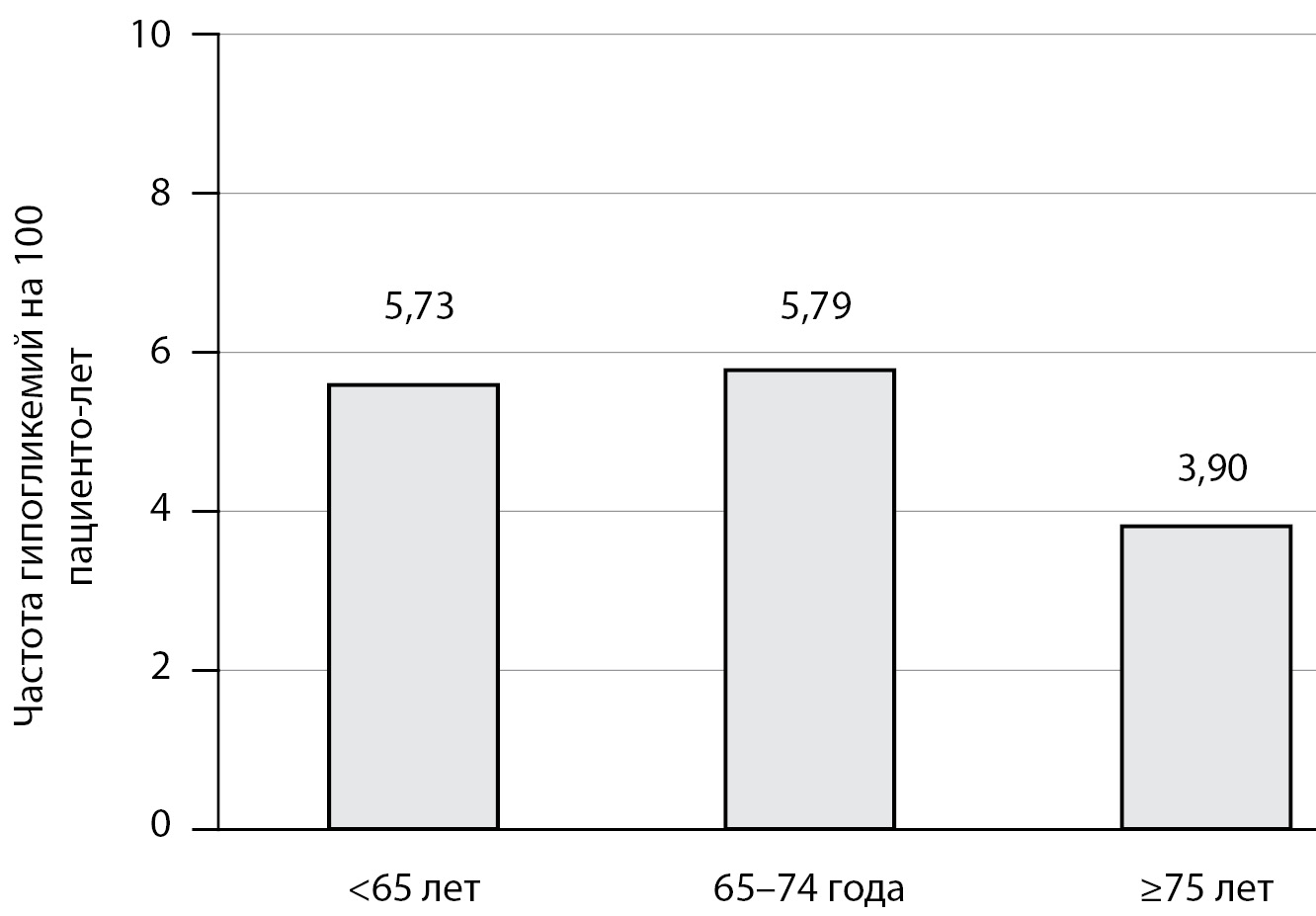 2. Рис. 2. Частота гипогликемий в различных возрастных категориях пациентов с сахарным диабетом 2 типа, получавших ситаглиптин в добавление к препаратам сульфонилмочевины в течение двухлетнего периода наблюдения [43].