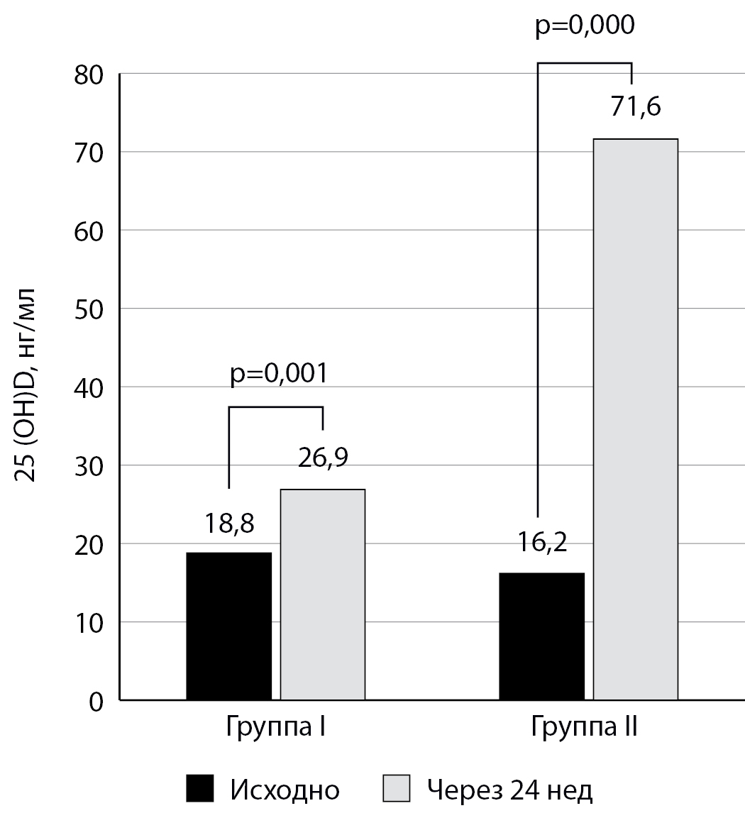 3. Fig. 1. Dynamics of indicators of the level of 25-hydroxyvitamin D in the blood serum against the background of a 24-week intake of colecalciferol. | |