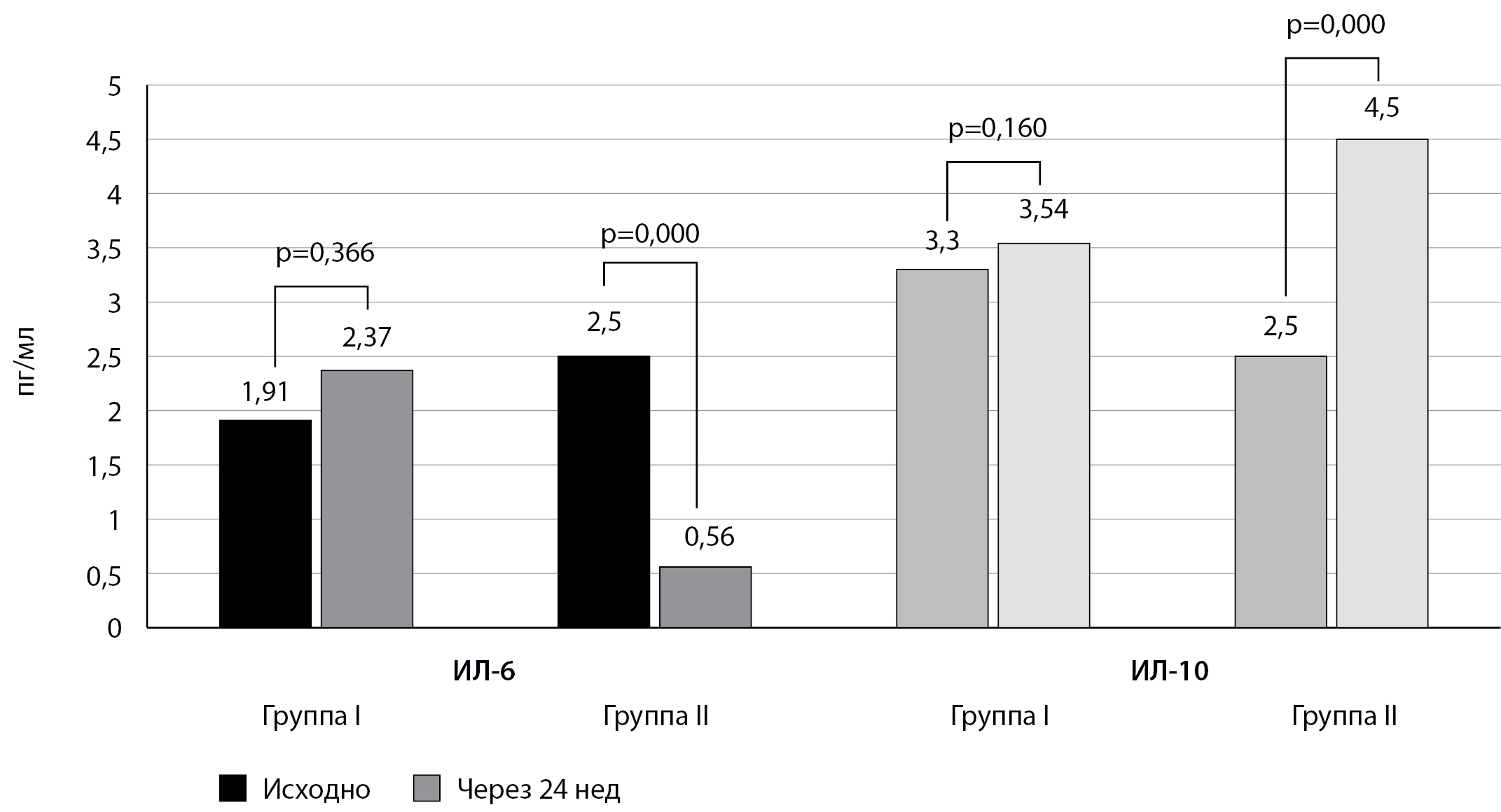 4. Fig. 2. Dynamics of indicators of the levels of IL-6 and IL-10 during therapy with various doses of colecalciferol for 24 weeks. | |