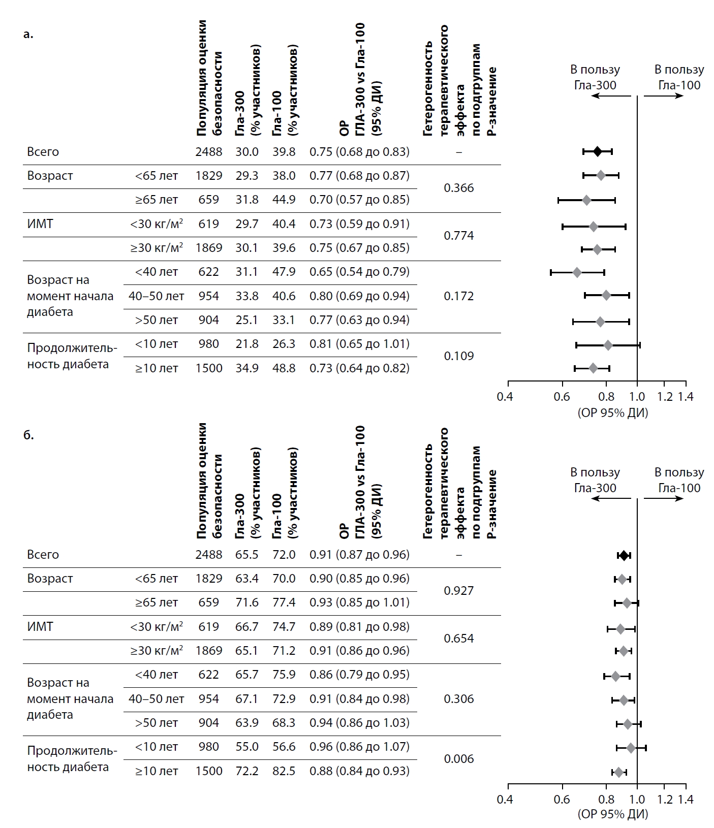 2. Fig. 2. Relative risk (RR) of confirmed (≤3.9 mmol / L) or severe hypoglycemia during the night (00: 00–05: 59 h) (a) and at any time of the day (24 h) (b), c within 6 months of treatment by subgroup (% of participants with ≥1 case; population for safety assessment; pooled data from EDITION 1, 2, and 3). * Diabetes duration not available for 8 participants | |
