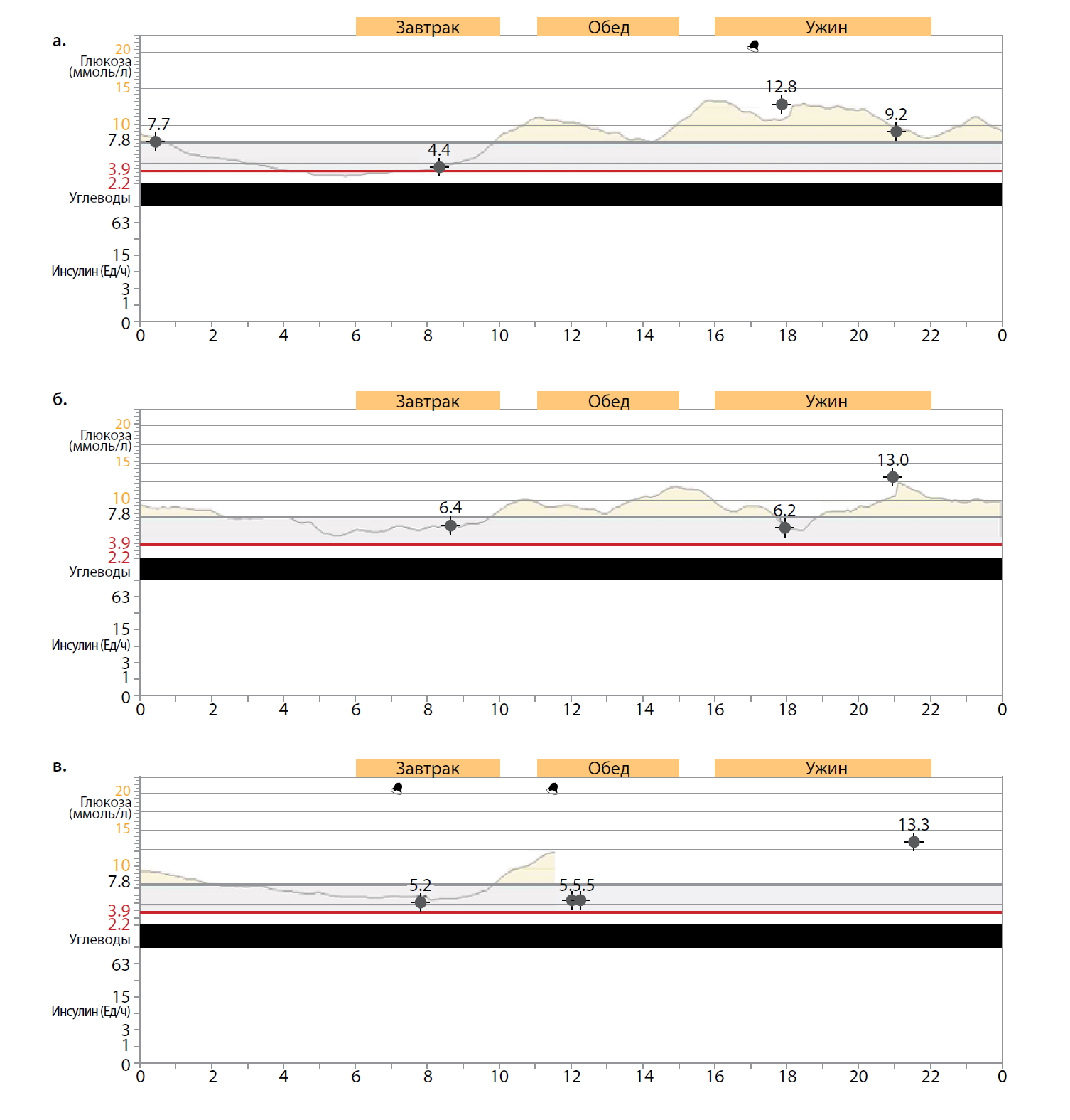 4. Fig. 4. Clinical case (continuous glucose monitoring data): transfer of patient G. (age 80 years) with type 2 diabetes mellitus (duration from diagnosis to 3 years) and late complications of the disease (myocardial infarction and acute cerebrovascular accident) with insulin glargine therapy 100 IU / ml once a day for insulin glargine 300 IU / ml once a day in a ratio of 1: 1; a) an initial study, prolonged hypoglycemia at night; b), c) during the second study, positive dynamics are noted - against the background of the use of insulin glargin 300 IU / ml hypoglycemia at night is absent. | |