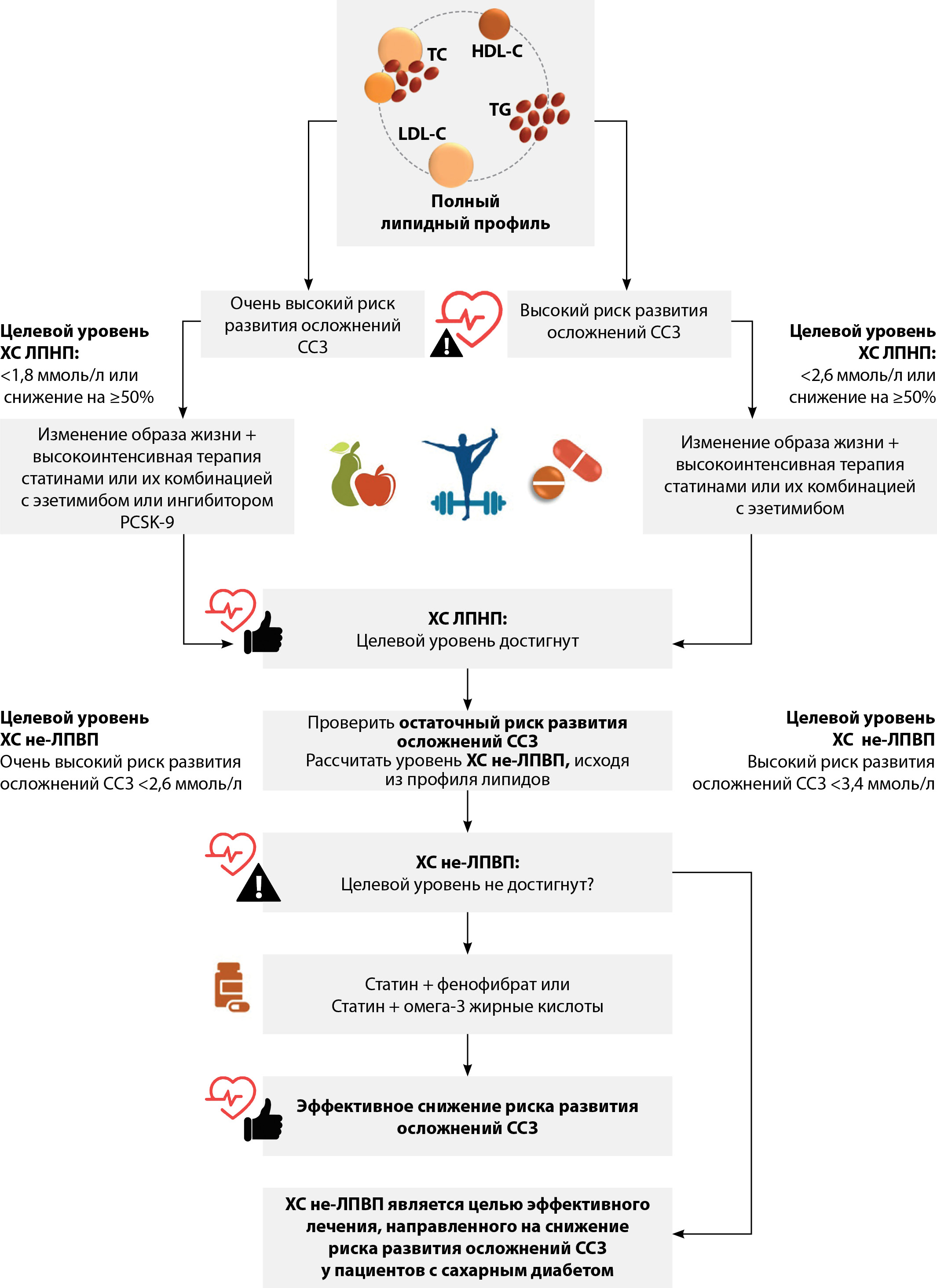 1. Fig. 1. Features of treatment to reduce the risk of complications of cardiovascular disease in patients with diabetes mellitus: SS - cardiovascular; HDL cholesterol - high density lipoprotein cholesterol; LDL cholesterol - low density lipoprotein cholesterol; PCSK-9 - Subtilizine / Kexin Type 9 Protein Convertase; TG - triglycerides; OH - total cholesterol | |
