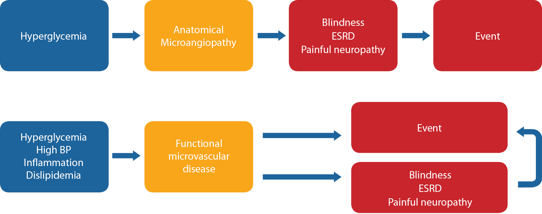 Согласно старой концепции, хроническое воздействие гипергликемии приводит к анатомическим повреждениям небольших сосудов и, в связи с этим, к структурным нарушениям в органах-мишенях. Новая парадигма (внизу) указывает на то, что в небольших сосудах, подверженных воздействию множества факторов риска, сначала возникают функциональные нарушения, которые могут привести к событию до формирования структурных повреждений.