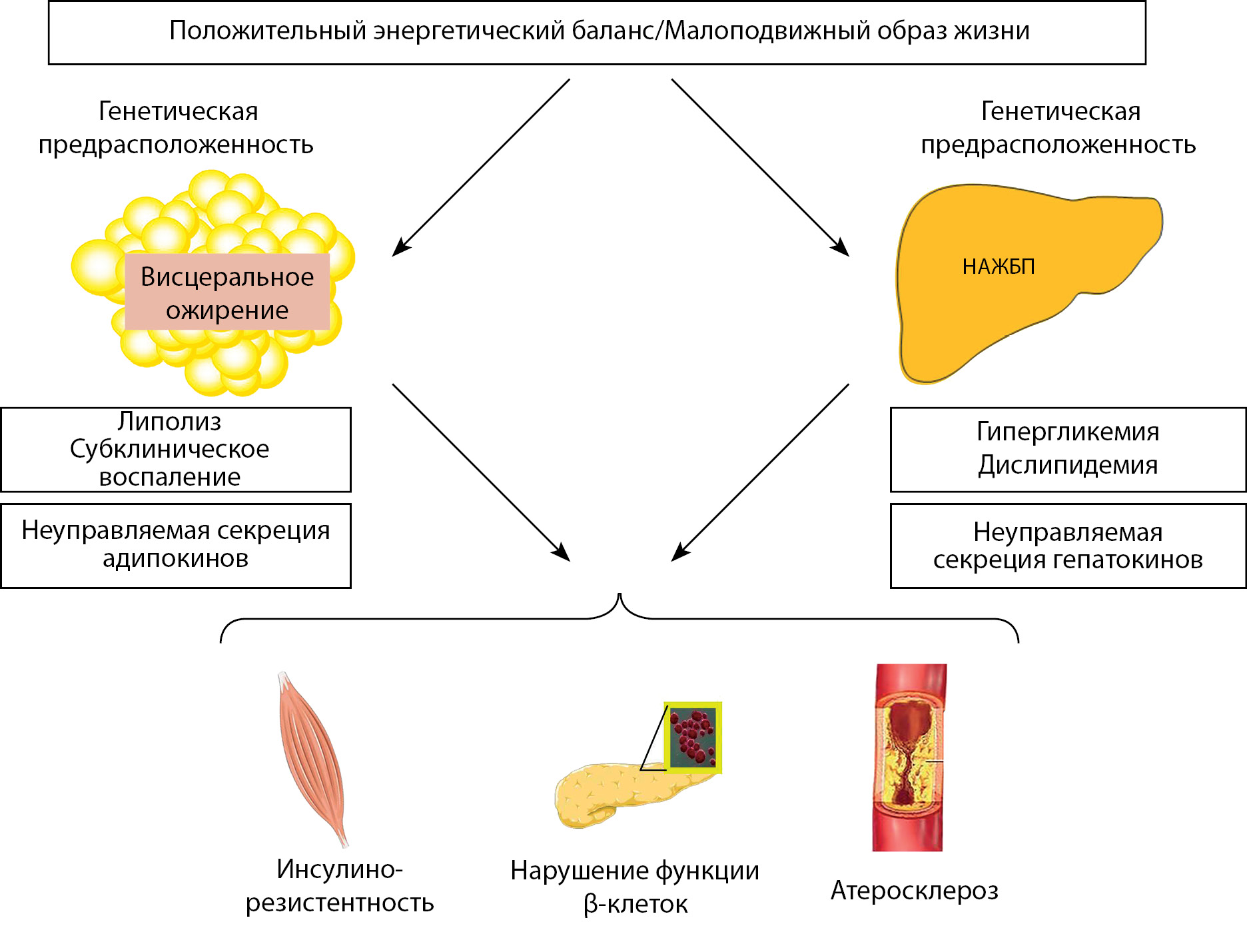 1. Рис. 1. Роль висцерального ожирения и неалькогольной жировой болезни печени (НАЖБ) в патогенезе сахарного диабета 2 типа и сердечно-сосудистых заболеваний (концепция неуправляемого синтеза адипокинов и гепатокинов).