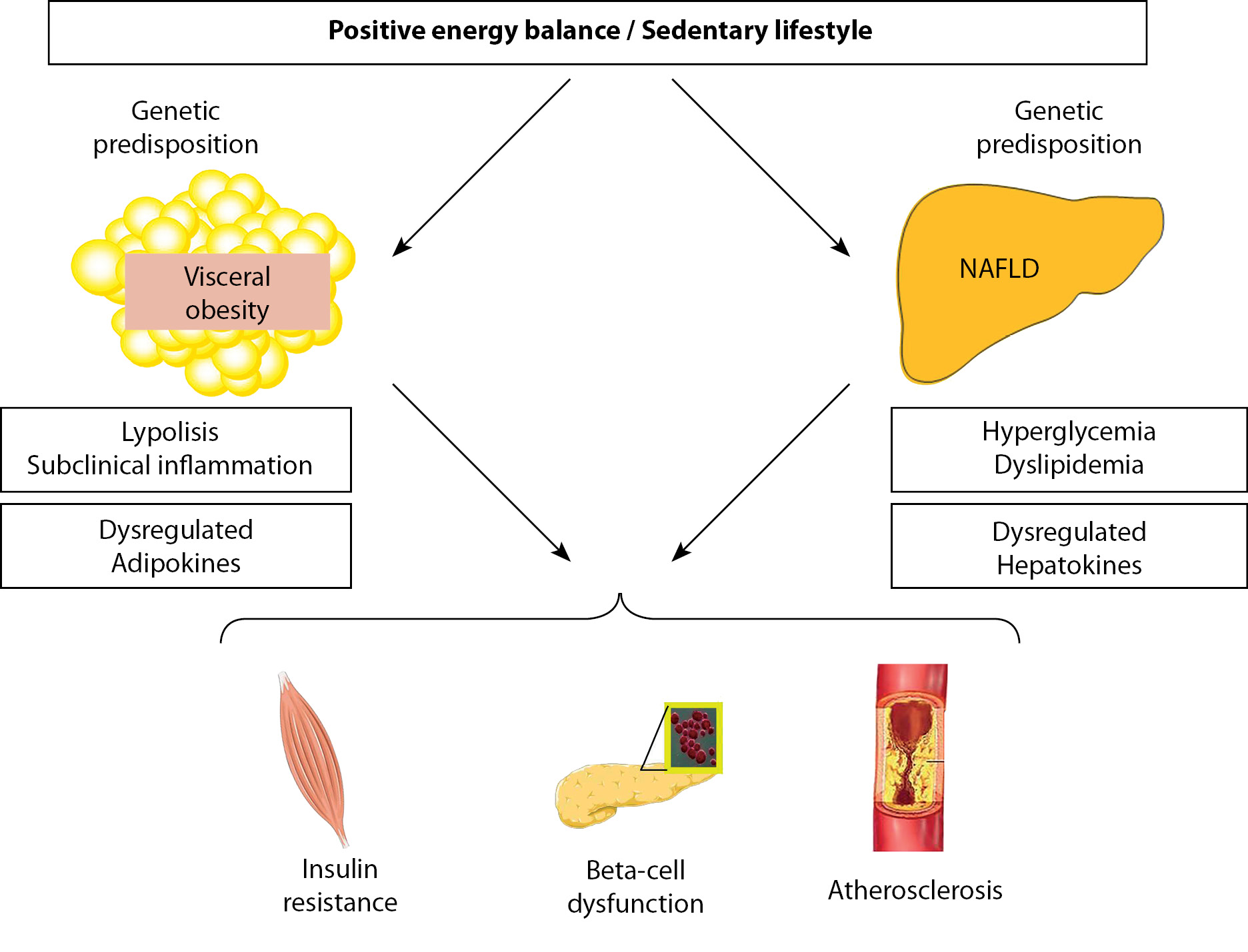 3. Figure 1. If a positive energy balance and a sedentary lifestyle converge with a genetic risk, visceral obesity and nonalcoholic fatty liver disease (NAFLD) develop. Visceral obesity via increased lipolysis, subclinical inflammation and dysregulated release of adipokines and NAFLD via hyperglycemia, dyslipidemia and dysregulated release of hepatokines induce insulin resistance, beta-cell dysfunction and atherosclerosis. | |