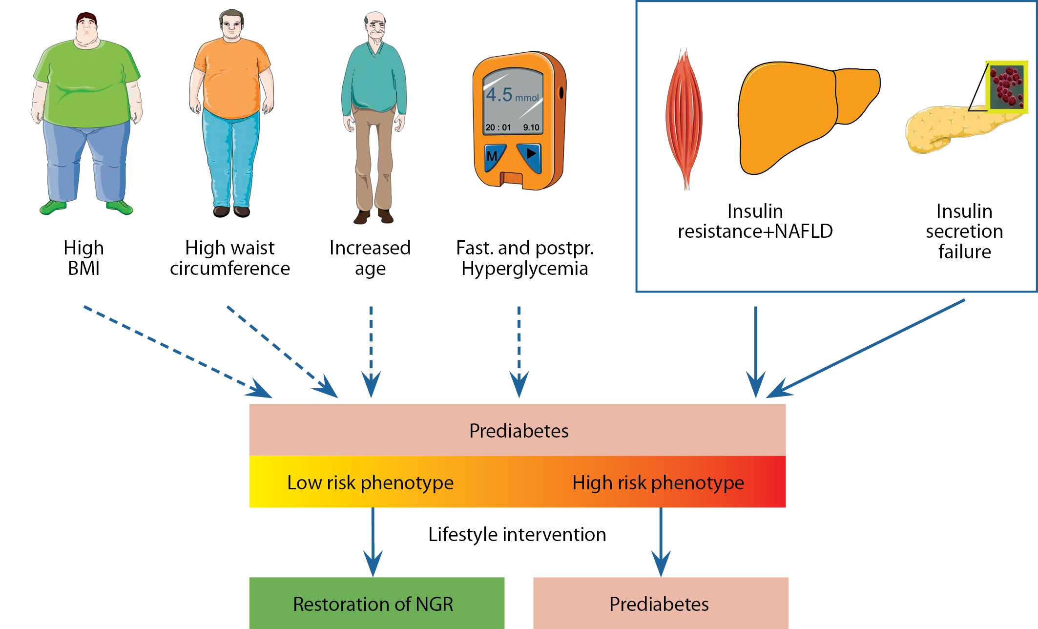4. Figure 2. Among the risk factors high body-mass index (BMI), high waist circumference, increased age, fasting and postprandial hyperglycemia, insulin resistance+NAFLD and insulin secretion failure, only the latter two predicted a low chance for a regression to normal glucose regulation in 120 subjects with prediabetes, who underwent a lifestyle intervention (36). | |