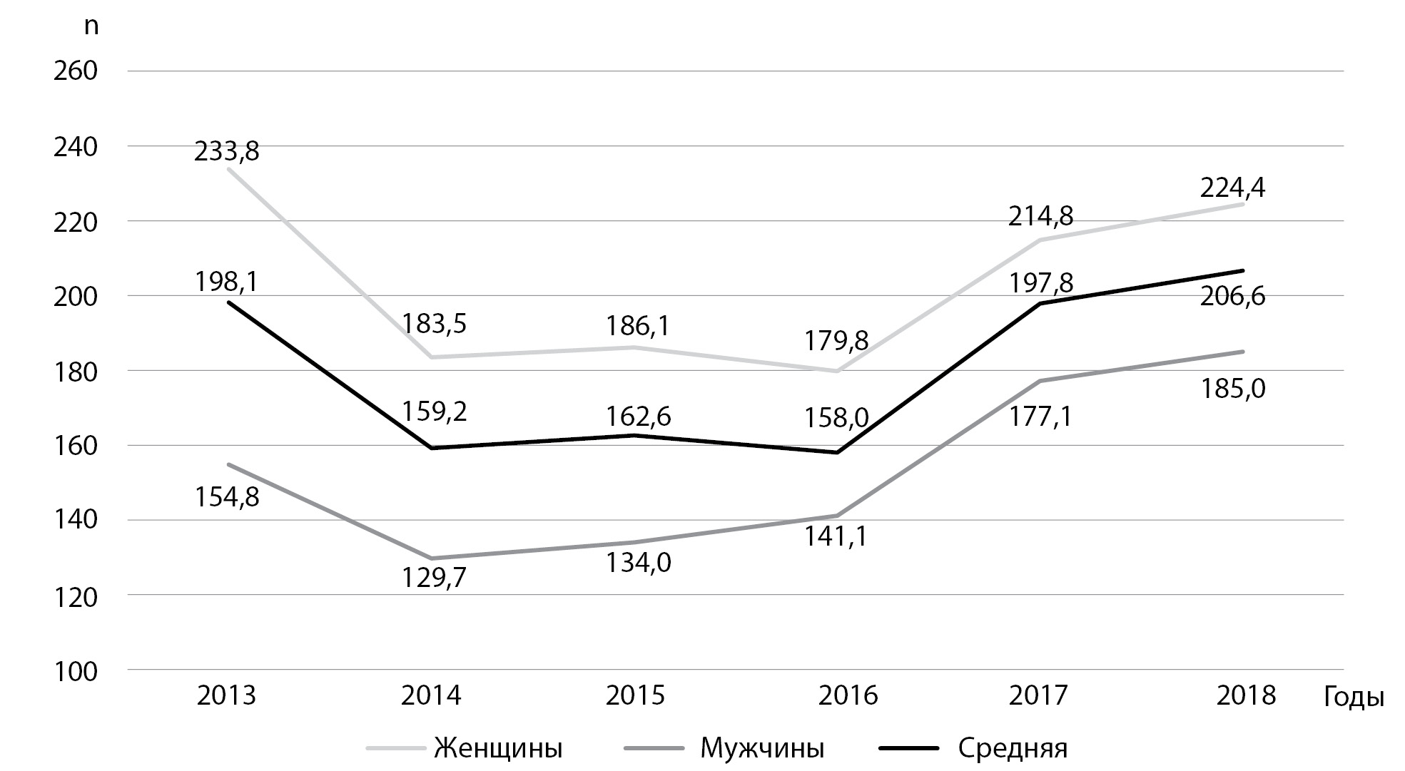 Распространенность СД2 среди женщин значительно превышала таковую среди мужчин (2315,2 на 100 тыс. среди мужчин и 3819,0 – среди женщин в 2018 г.) (см. рис. 6).